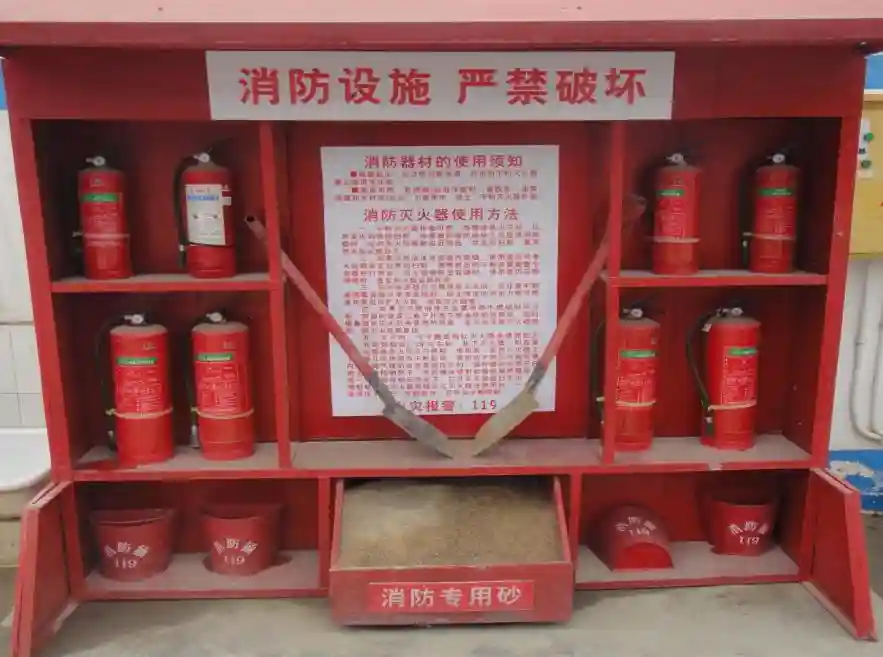 4.施工现场沿主施工道路每隔80米设置1个消防器材集中点,内配备消防斧、消防铲、消防桶、灭火器,底部MU10灰砂砖,M5水泥砂浆砌筑消防砂池,外侧及顶面20mm厚1:3水泥砂浆抹面。