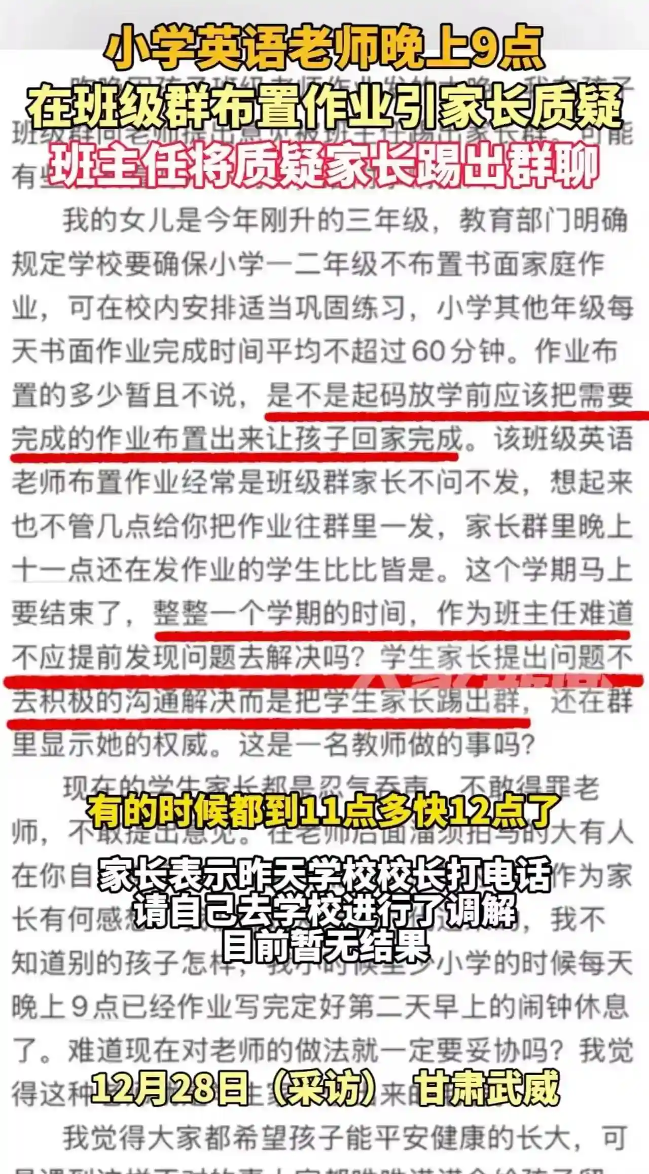 “终于有家长站出来了!”甘肃武威,小学英语老师晚上9点在班级群布置作业,家长怒怼:“9点半了发个作业写还是不写?你们上学的时候老师也这样布置作业吗?”可班主任却将家长踢出了群,家长不服气,决定给老师上一课。