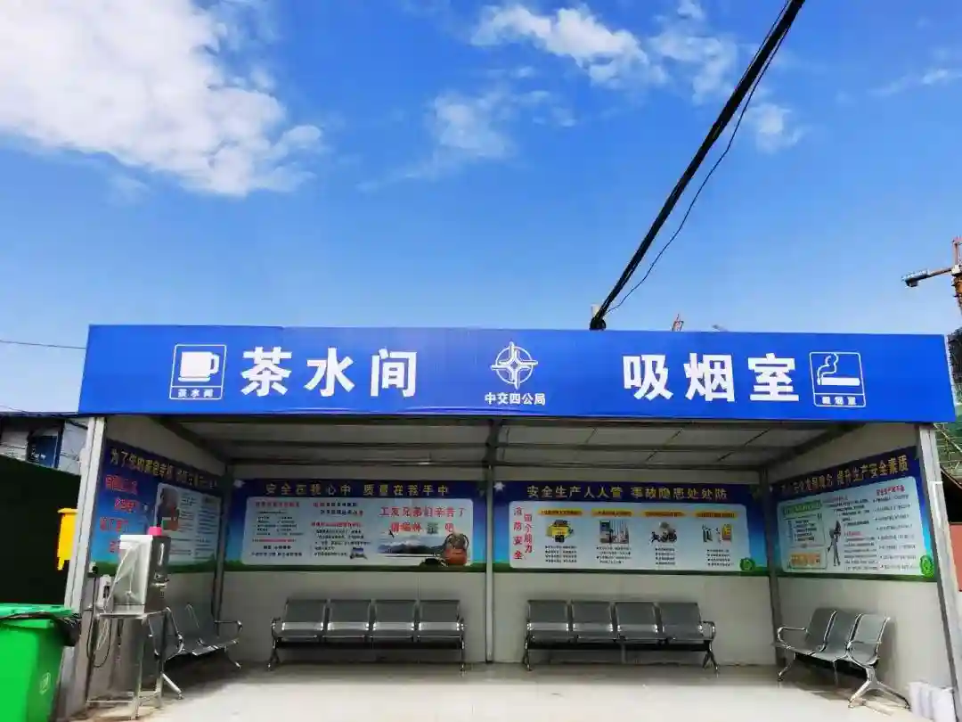 我是员工休息亭,在炎炎烈日下劳作,免不了疲劳口渴。这时候,大家可以来我这里休息一下,喝杯茶水,给身体充充电,然后以更饱满的精神投入到工作中去。休息一下,祛疲劳,更安全。