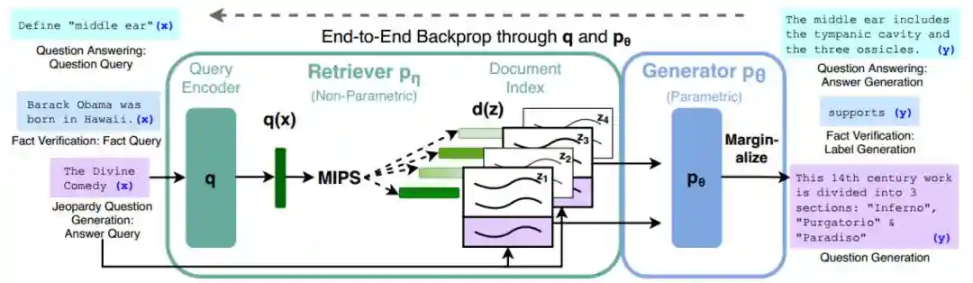 ►检索系统(Retriever):检索环节包括需求编码器(QueryEncoder)和文档索引(DocumentIndex)。使用两个不同的BERT模型将需求q与文档z分别编码为q(x)和d(z),进而使用最大内积搜索算法获取内积最大的文档,将其与需求共同输入生成部分。