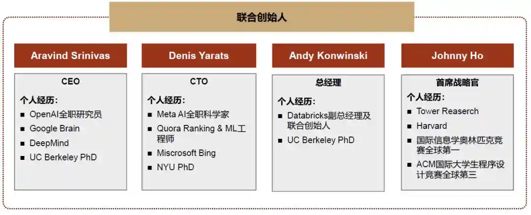 创始人兼具技术实力与行业洞察力。Perplexity创始人为AravindSrinivas、DenisYarats、AndyKonwinski以及JohnnyHo四位。Srinivas曾于Google、DeepMind实习且曾就职于OpenAI。Yarats曾在微软Bing、问答网站Quora、Facebook担任人工智能研究人员或工程师。Konwinski为DataBricks的联合创始人。JohnnyHo曾在Quora担任工程师,研究排名与后端系统,引领系统快速迭代。