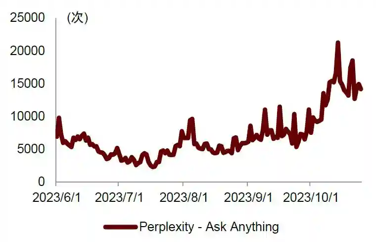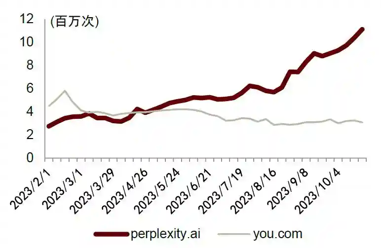 周度访问量环比高增,用户基础持续扩张彰显高粘性和成长性。Perplexity成立于2022年8月,致力于开发基于AI能力的对话式搜索引擎,以优化用户发现和共享知识的方式。2022年12月公司正式发布首个对话式搜索引擎Ask,此后其用户规模不断扩大,在四个月内月活跃用户数达到200万。根据SimilarWeb数据,截至2023年10月25日,PerplexityAPP的日度下载量为14,163次;2023年2月1日至10月25日,Perplexity网页端的周度访问量由275万增加至1,113万,增长3x;与同类别的AI搜索应用YouChat相比增长势头强劲。