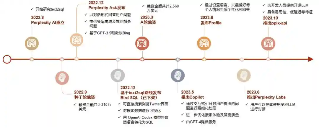 Perplexity成立于2022年8月,早期即确定AI搜索引擎路径,侧重产品力及快速迭代。成立之初,公司技术定位于text2sql(将自然语言翻译转化为SQL),但受制于技术的先进性以及SQL市场难以建立通用解决方案,这条路径并没有行通。2022年11月30日ChatGPT推出的背景下,业界迅速认可大模型的泛化通用能力。2022年12月,公司借势推出第一款核心产品PerplexityAsk,定位AI搜索引擎,并推陈出新,先后推出BirdSQL、Copilot、Profile、pplx-api等产品,同时对PerplexityAsk及Copilot进行了快速迭代。纵观整体产品矩阵,我们可以发现公司始终专注于支持引用的AI搜索引擎,通过创新迭代优化其性能,不断提升客户的用户体验。