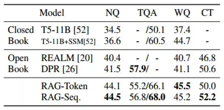 注:NQ、TQA、WQ、CT分别为NaturalQuestions、TriviaQA、WebQuestions和CuratedTrec四个数据集。