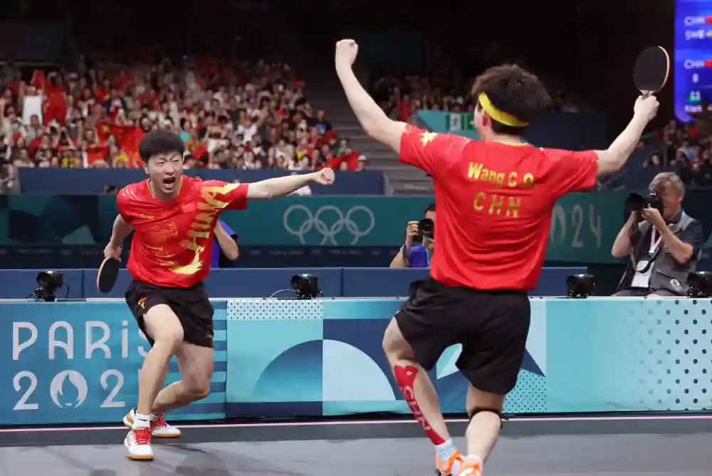 8月9日,中国队组合马龙(左)/王楚钦庆祝胜利。新华社记者刘续摄