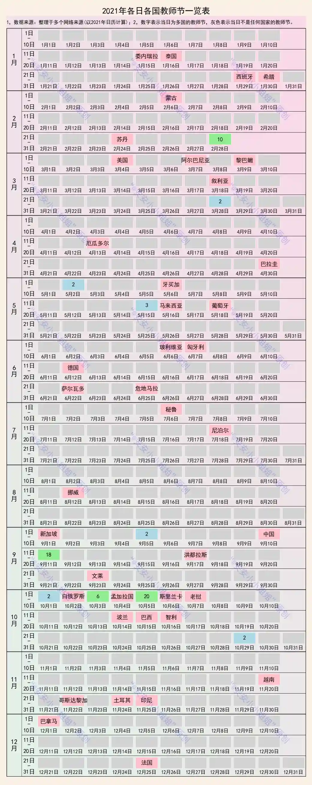 今日的数据,来盘点下2021年,世界各国的教师节日期。