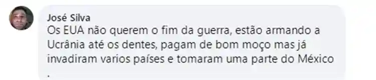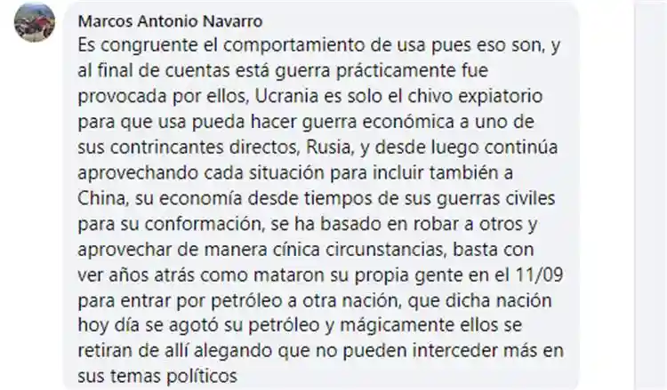 有西语网友表示,这场战争实际上是因美国而起,乌克兰只是替罪羊,美国却可以借此向俄罗斯挑起经济战:“美国当然还会继续利用各种事件,届时将把中国也卷进来。美国的经济从很久之前内战时期就是建立在窃取和利用别人的成果之上的,看看9.11事件,美国为了获取另一个国家的石油,杀了自己的人民,而另一个国家今时今日已经石油枯竭。荒谬的是此时美国说要撤军,借口说他们不再介入别国的政治了。”