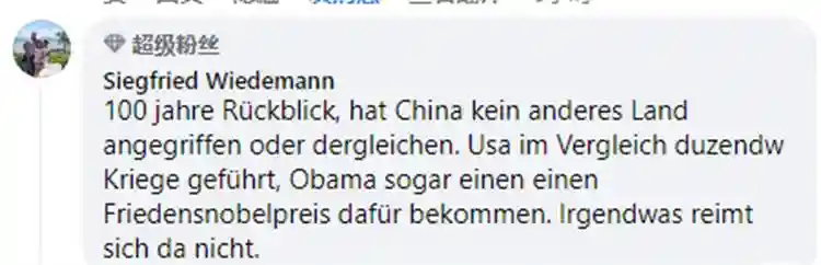 “中国正在乌克兰和俄罗斯之间发挥建设性作用,而美国则制造障碍,没有对未来的和平进程摆出一个良好的姿态。”“回望100年来,中国从没侵犯过其他国家。相比之下,美国发动了十几场战争。奥巴马竟然还获得了诺贝尔和平奖。难以苟同。”
