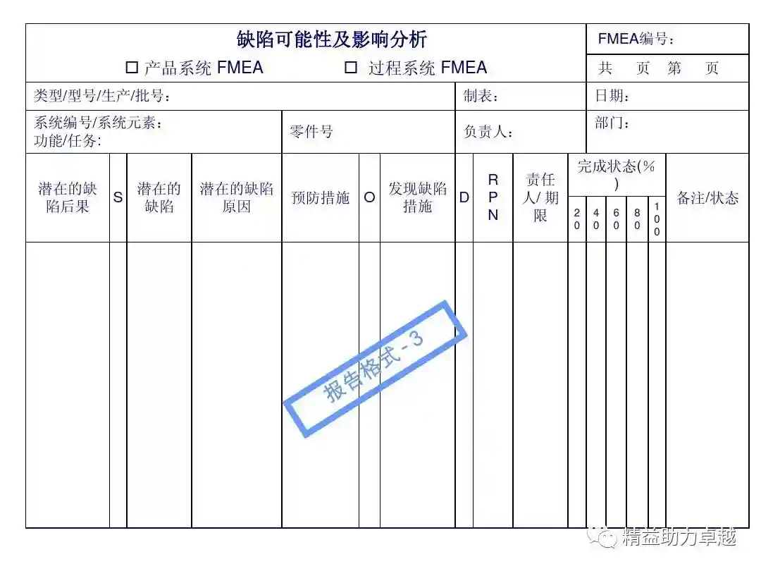 “潜在失效模式与后果分析”简称“FMEA”,是一种系统化的工程设计辅助工具,主要是利用表格方式协助工程师进行工程分析,使其在产品设计与制程规划时,能够及早发现潜在的缺陷及其影响程度,及早的谋求解决之道,以避免失效的发生,或者降低其发生时产生的影响。