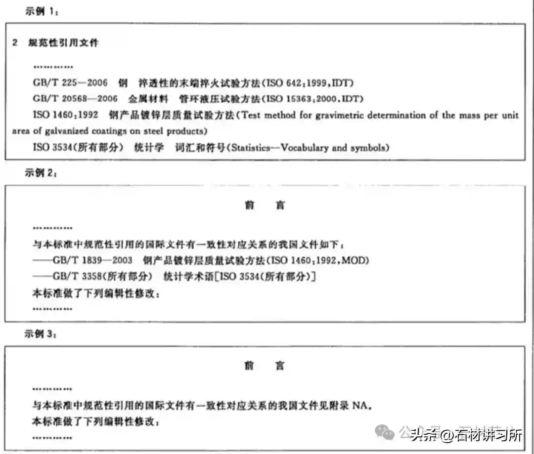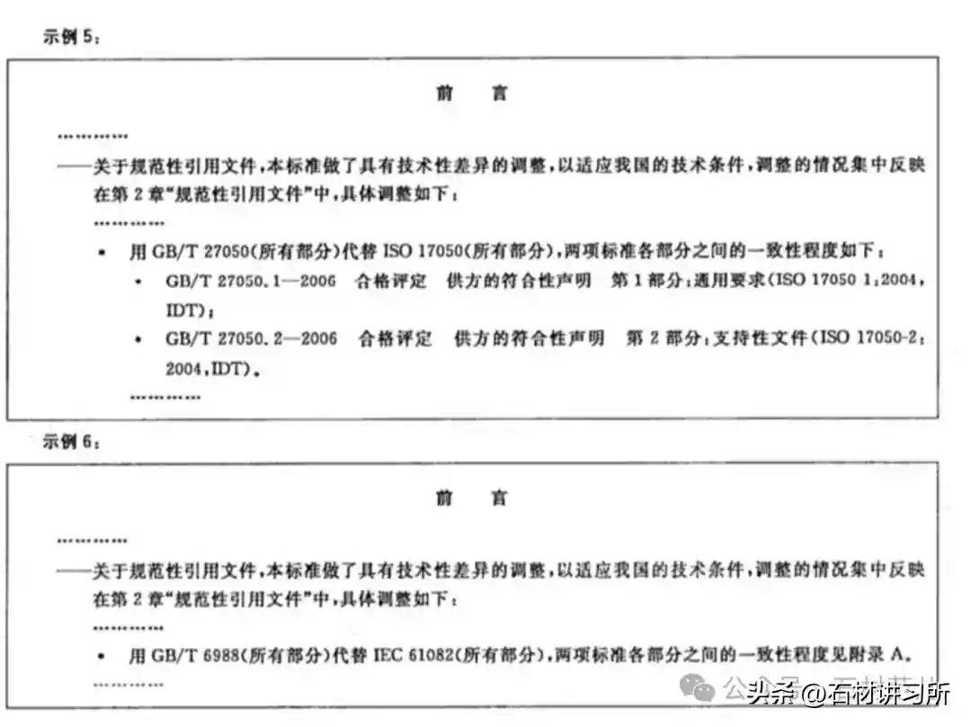 示例1至示例4给出了通常情况下国家标准前言中陈述有关采用国际标准的介绍性内容及陈述顺序。