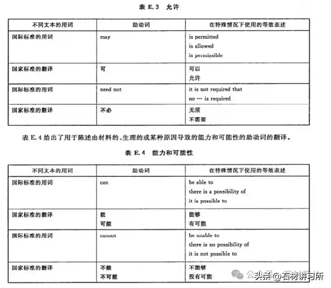 表至表给出了国际标准条款表述中使用的各种类型的助动词,包括首选的和等效的表述,同时给出了我国标准表述中相应助动词的选择。