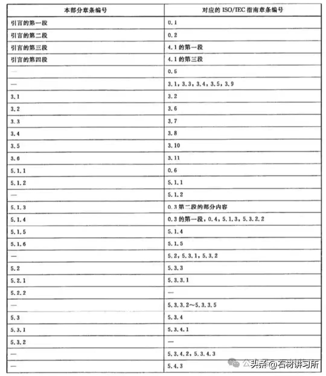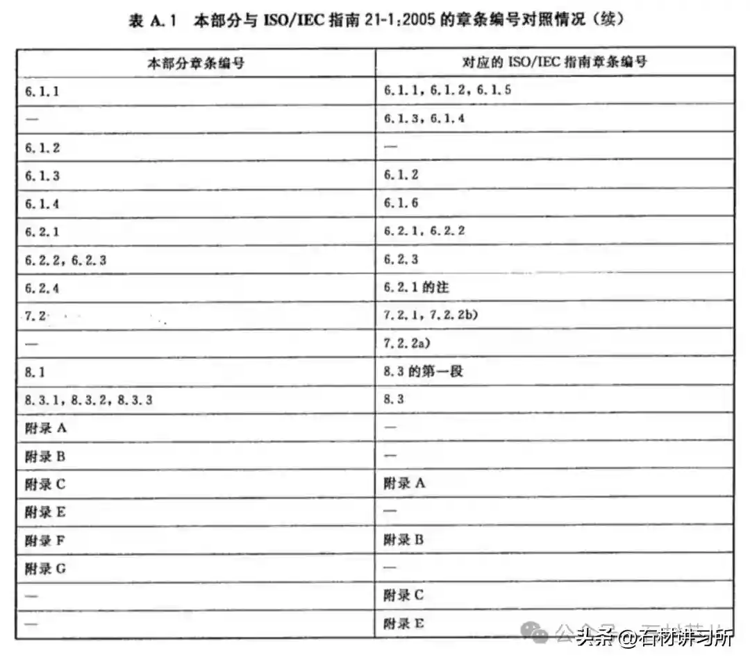 表本部分与ISO/IEC指南21-1:2005的章条编号对照情况