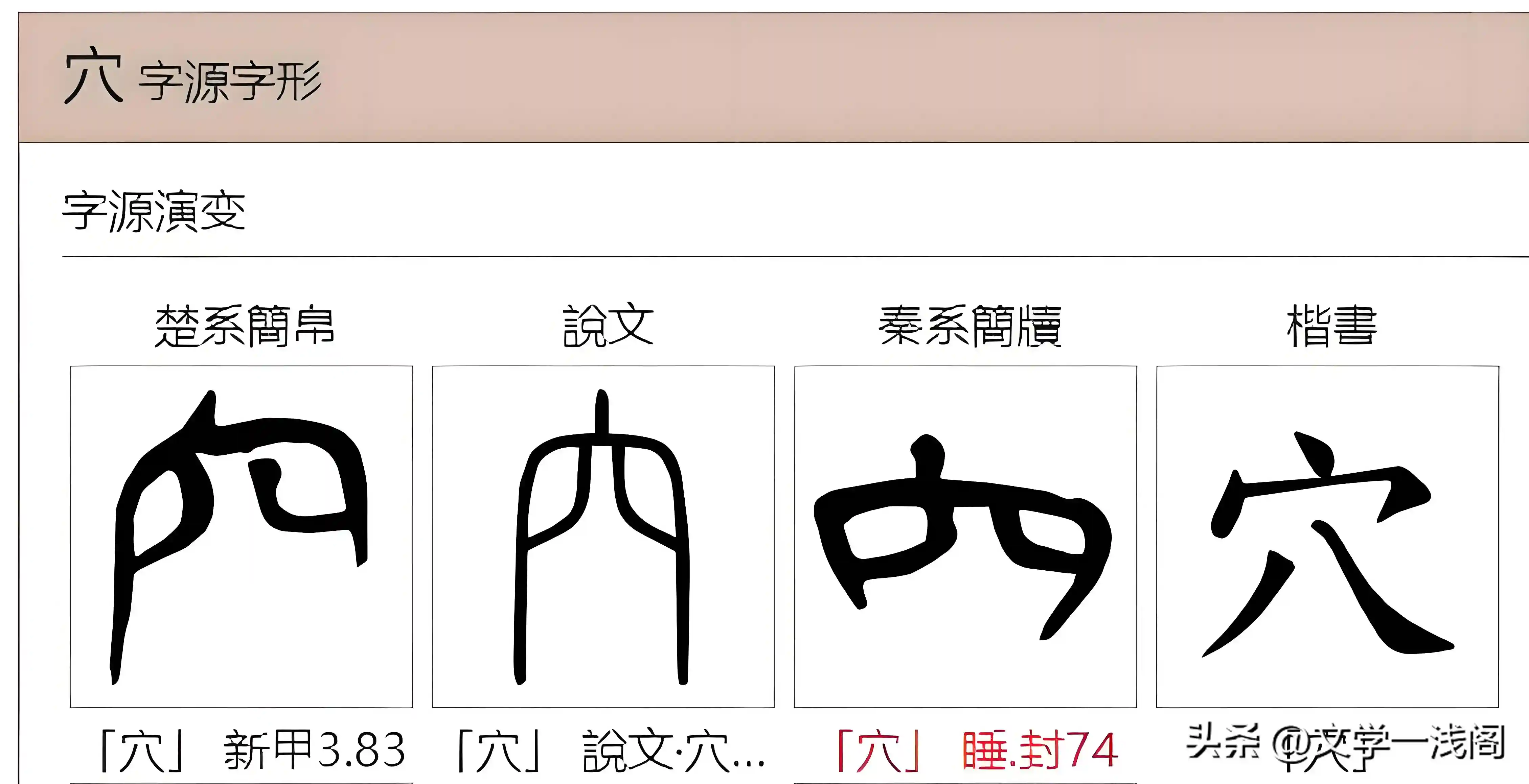 “窃”由“穴”和“切”两部分组成。“穴”作为部首,甲骨文字形类似一个岩洞或土穴,这是本义。金文、楚系简帛时,又在上部“挖”了两个小洞。小篆字形逐步方正,有点类似“内”字形。再后来逐步简化,成了楷体的“穴”,作为部首时,变为“穴”。