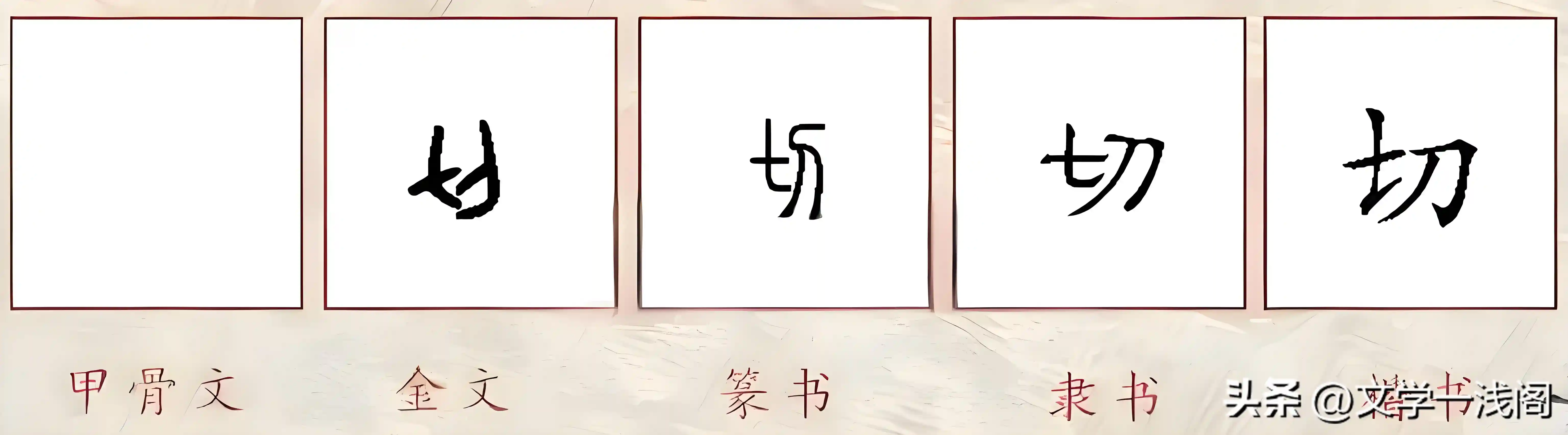 “切”的小篆字形,左边类似“七”,右边为“刀”形,隶化后逐步方正,到了楷书时,直接成为了“切”字,表示用刀用力向下切东西。“窃”字形本义指,在洞穴或房屋里,持刀或某种工具偷盗财物。