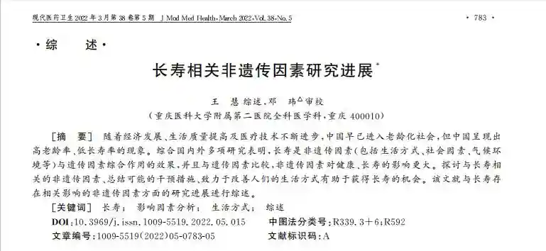 [1]王慧,邓玮.长寿相关非遗传因素研究进展[J].现代医药卫生,2022-03-15
