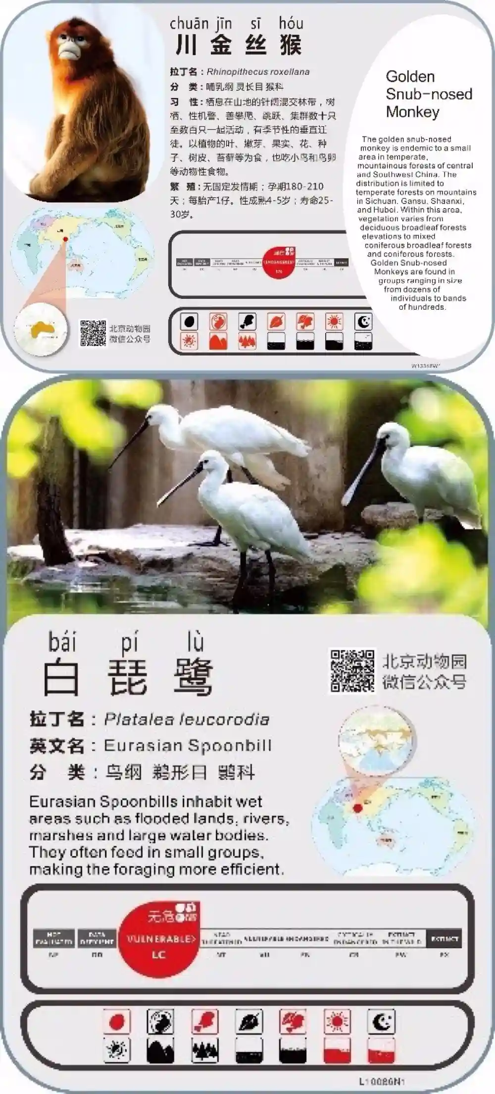 新版说明牌共包括以下七项内容:中文名、英文名及物种英文说明、物种形象、物种相关信息、物种世界分布状态、IUCN红色名录、给小朋友的科普贴士等部分。大小朋友可以在国庆节假期再来动物园,长知识的同时,也可以追寻儿时记忆。