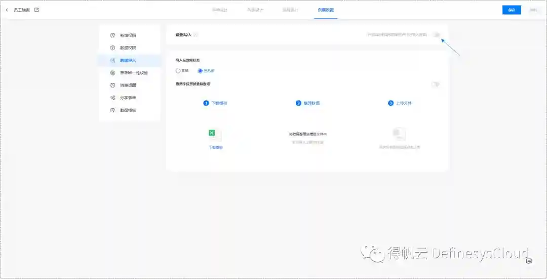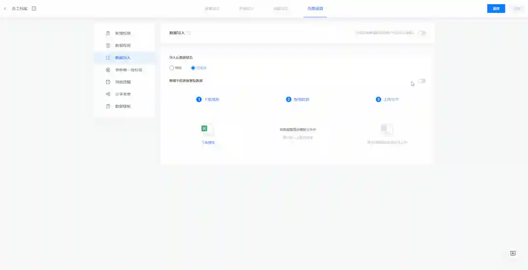 开启箭头所指的数据导入按钮,则有新增权限的用户都可以导入数据。