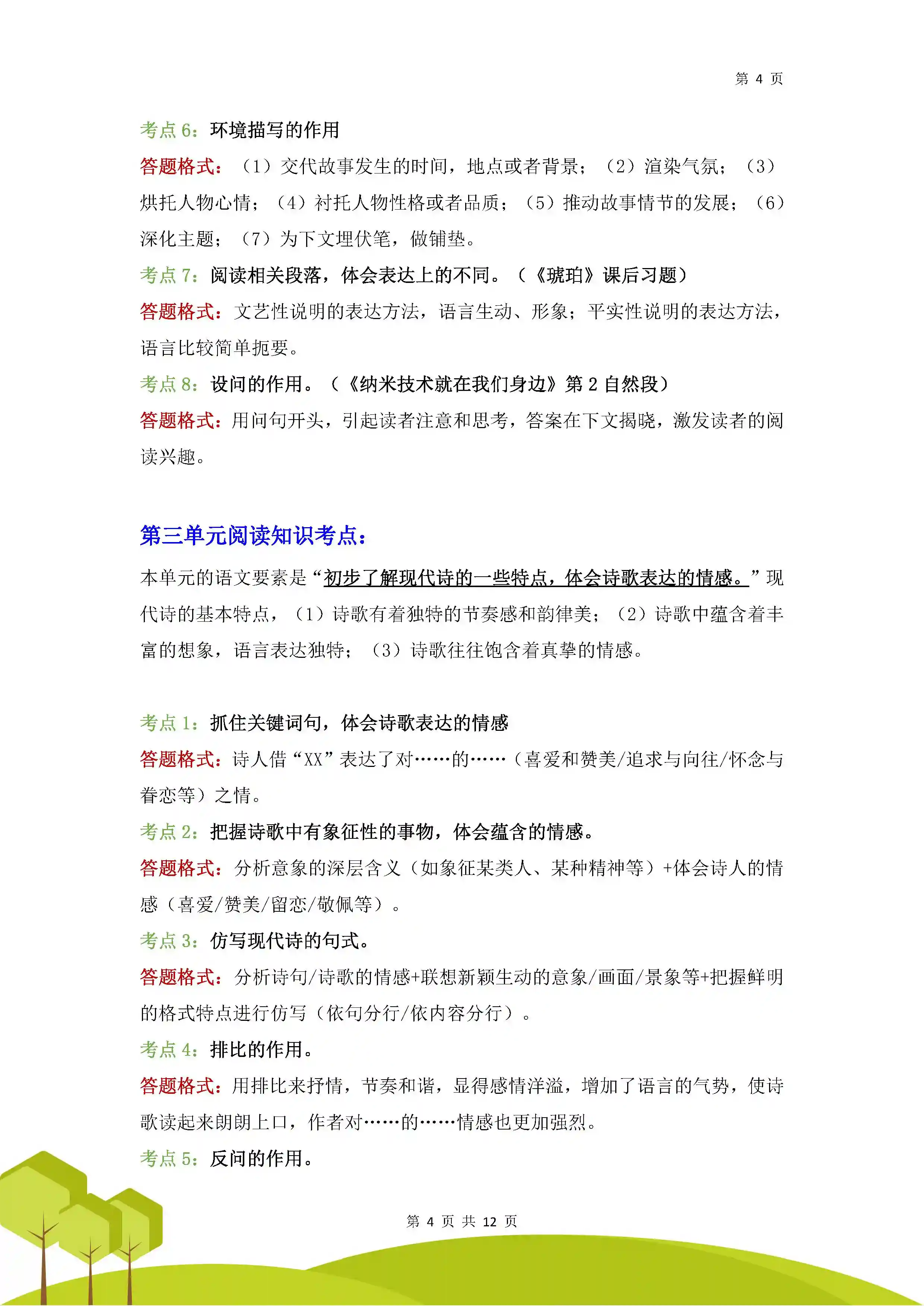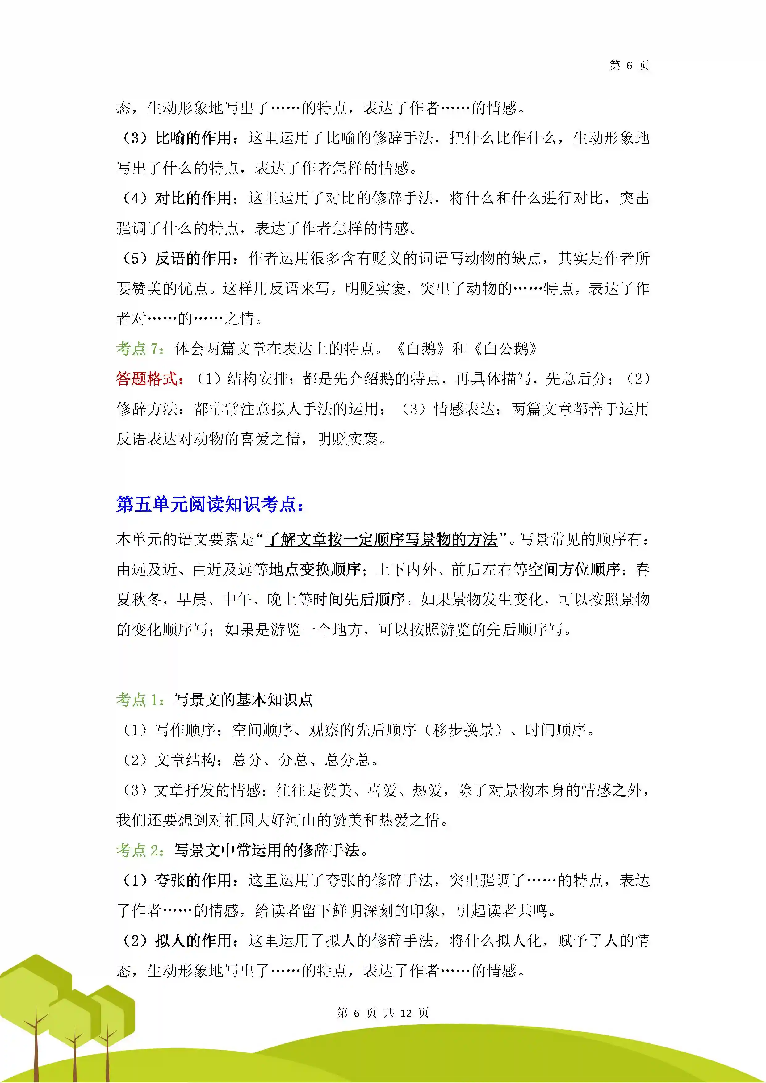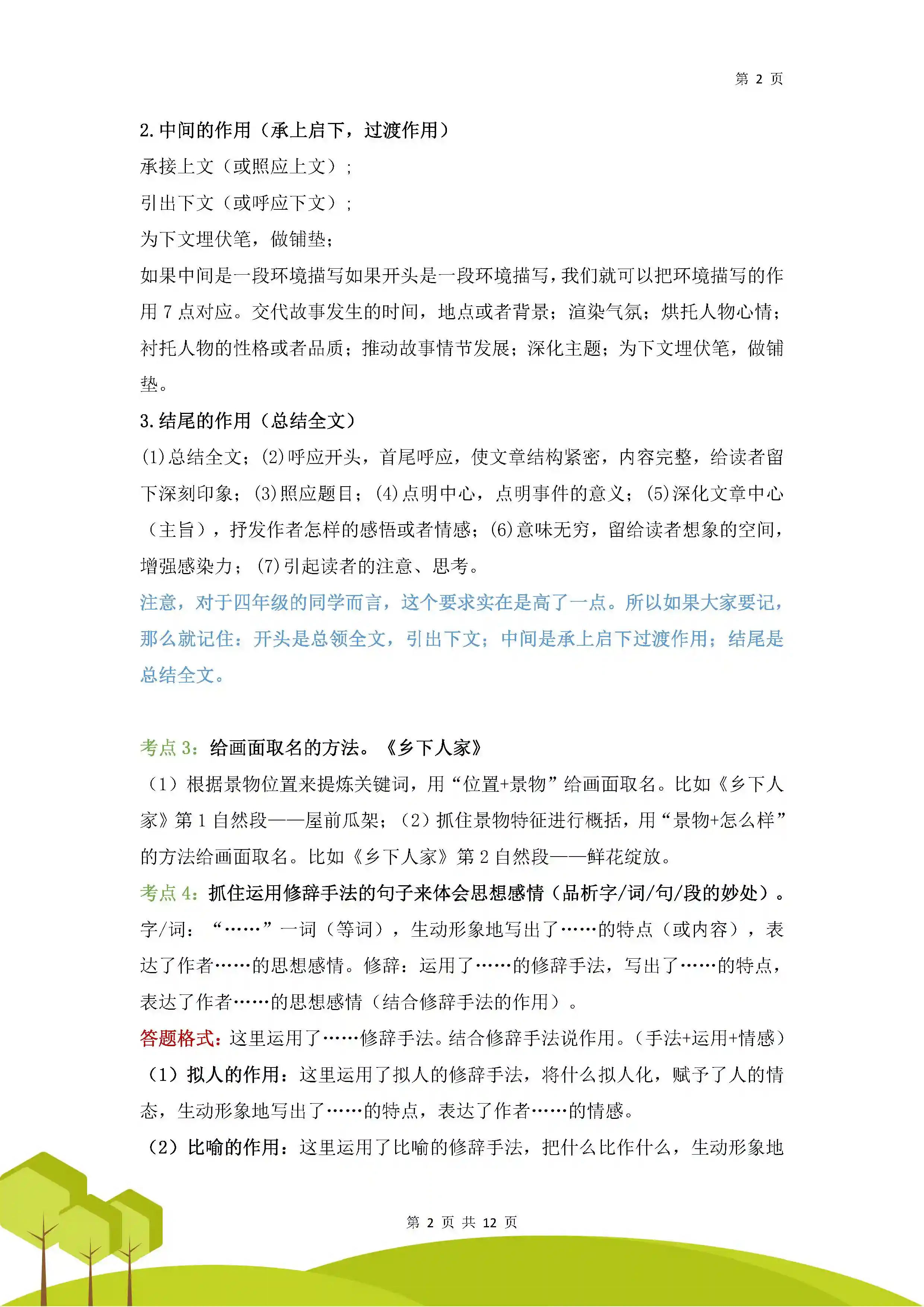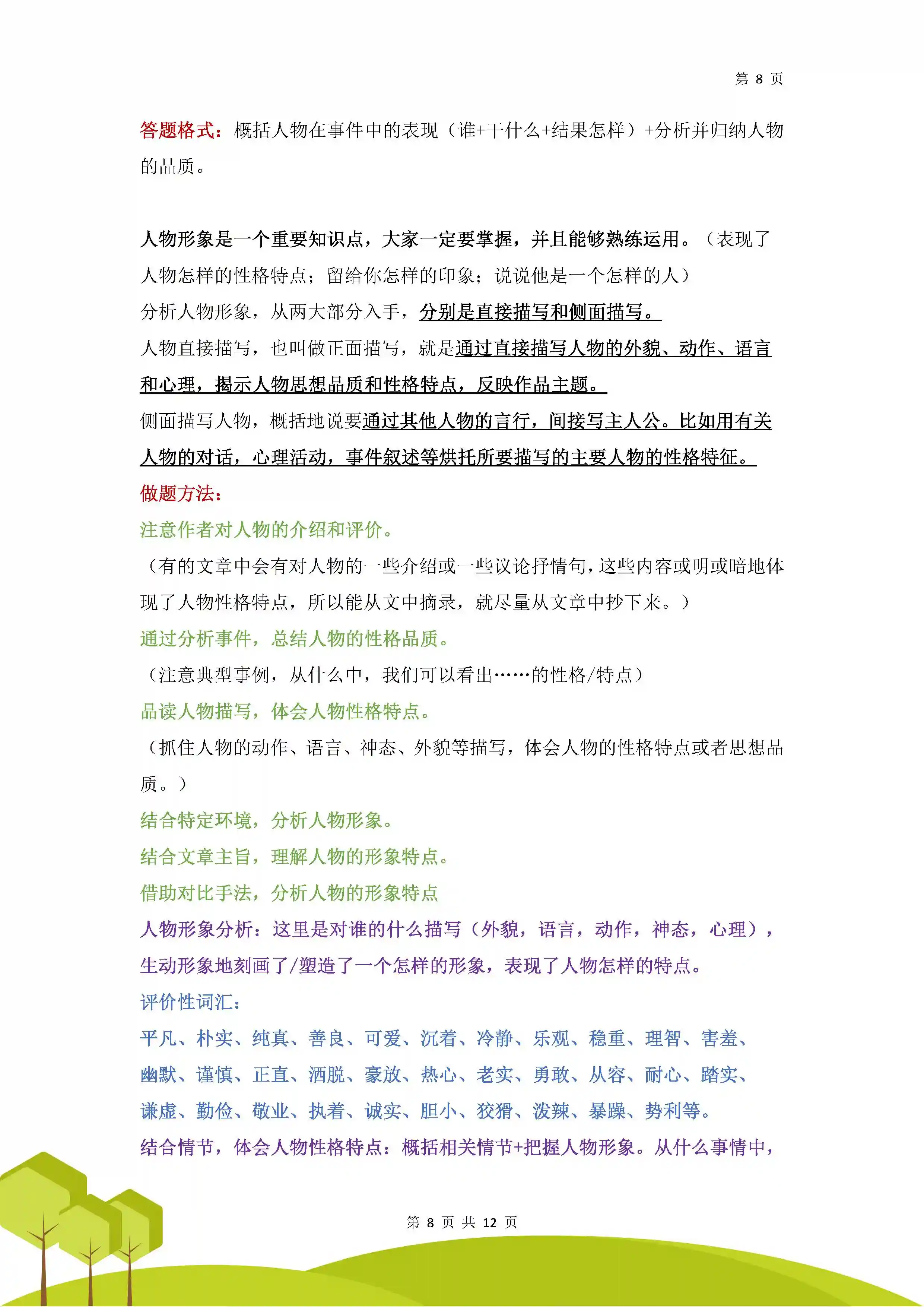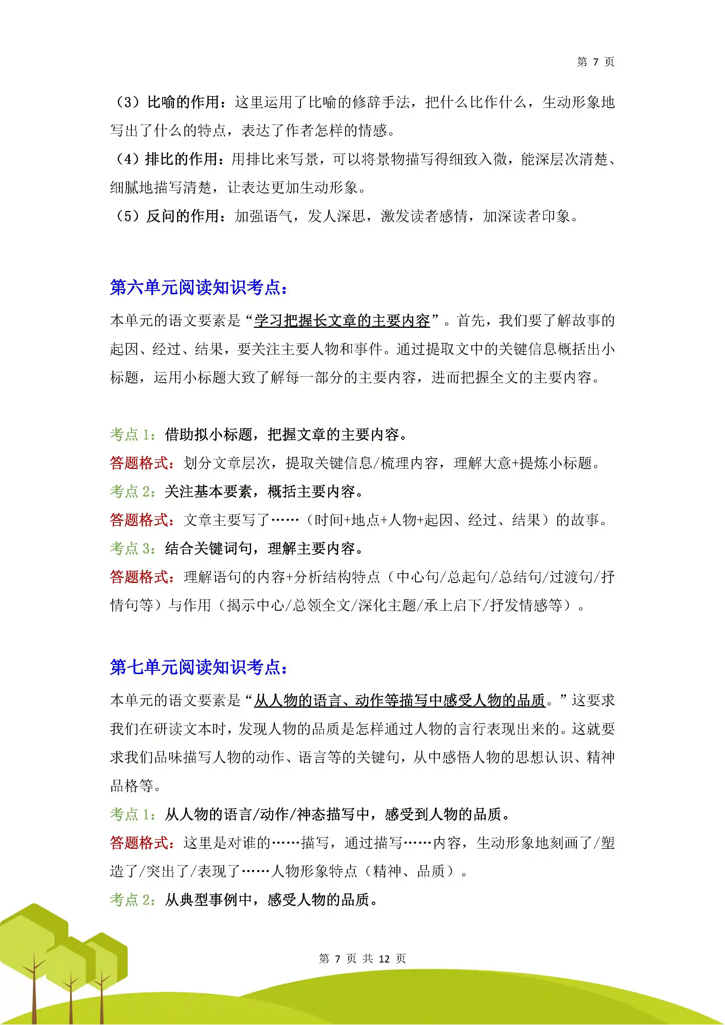 7.总结概括:整理篇章框架,梳理部分内容,概括出作者要表达的思想内容。