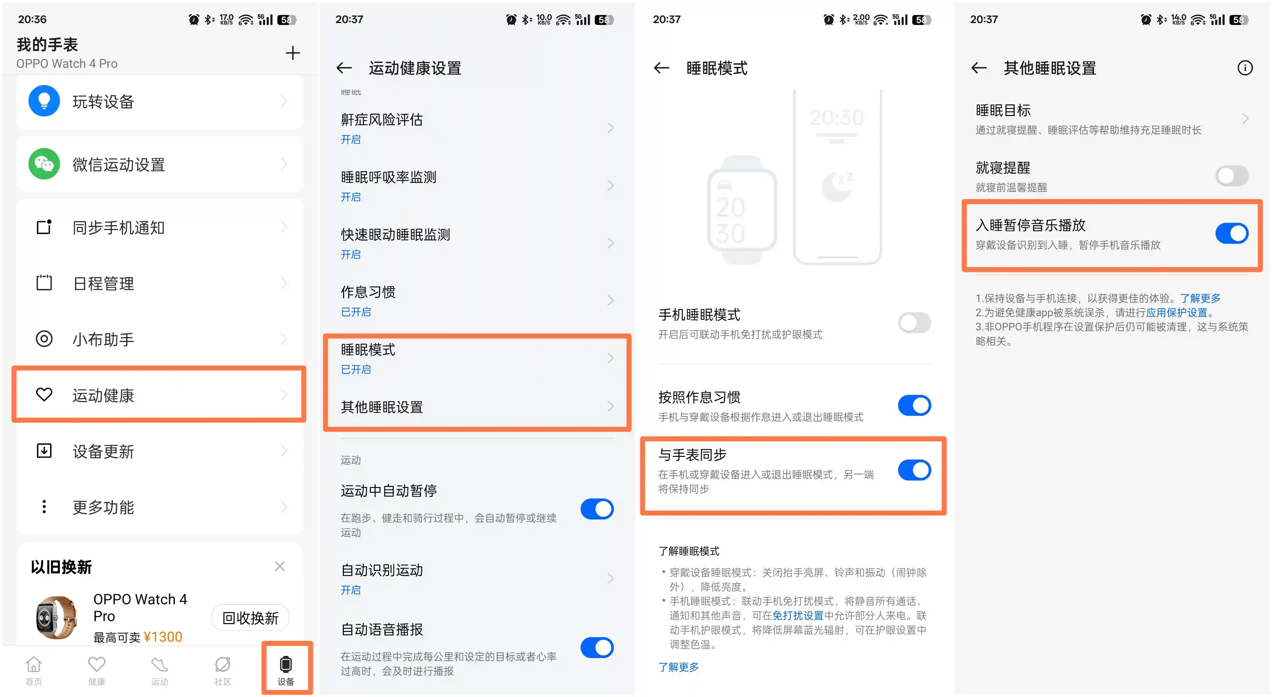 开启方法:进入「健康」——设备——运动健康——睡眠模式——开启「与手表同步」