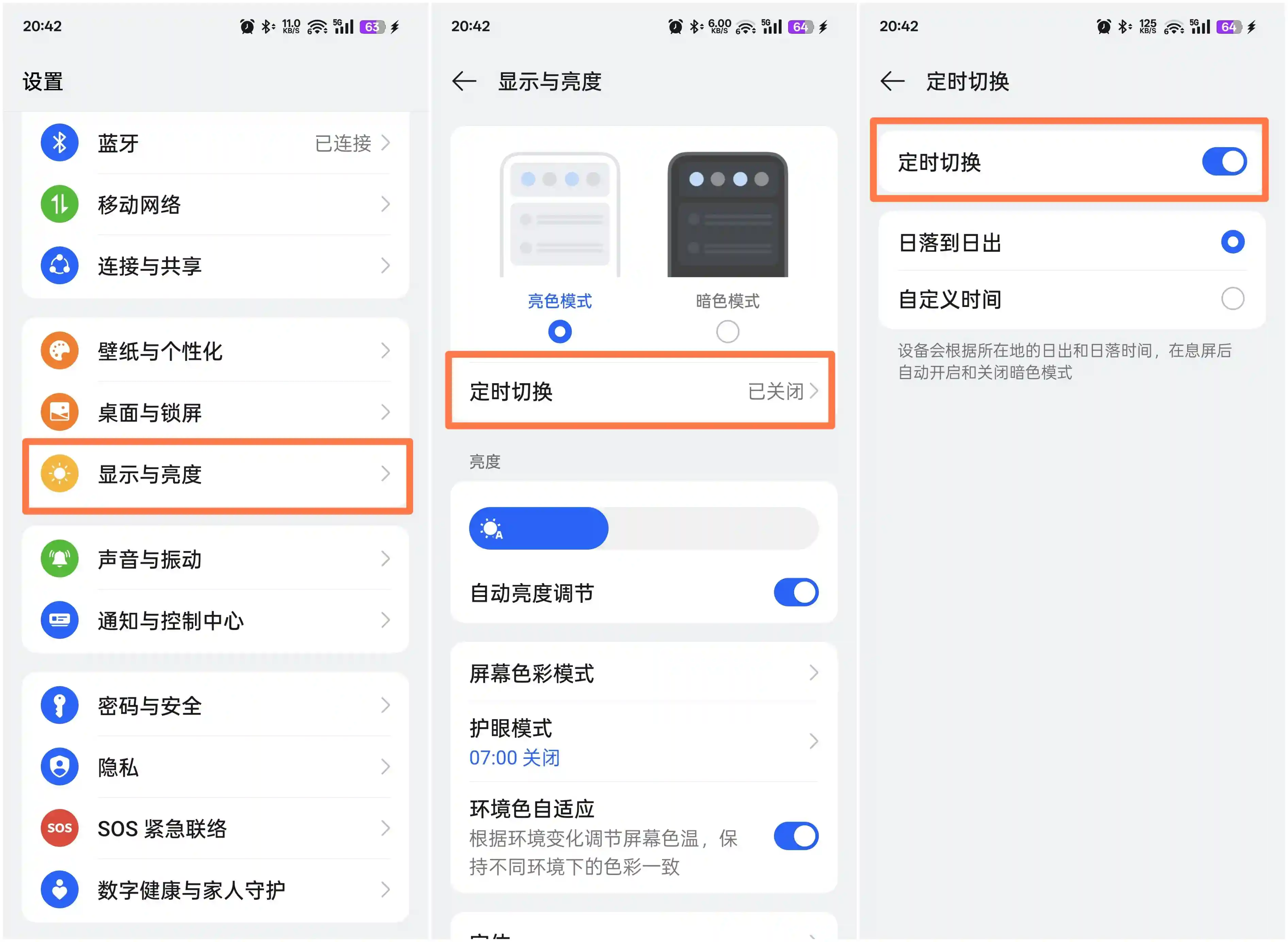 开启方法:进入「设置」——显示与亮度——定时切换——开启「定时切换」