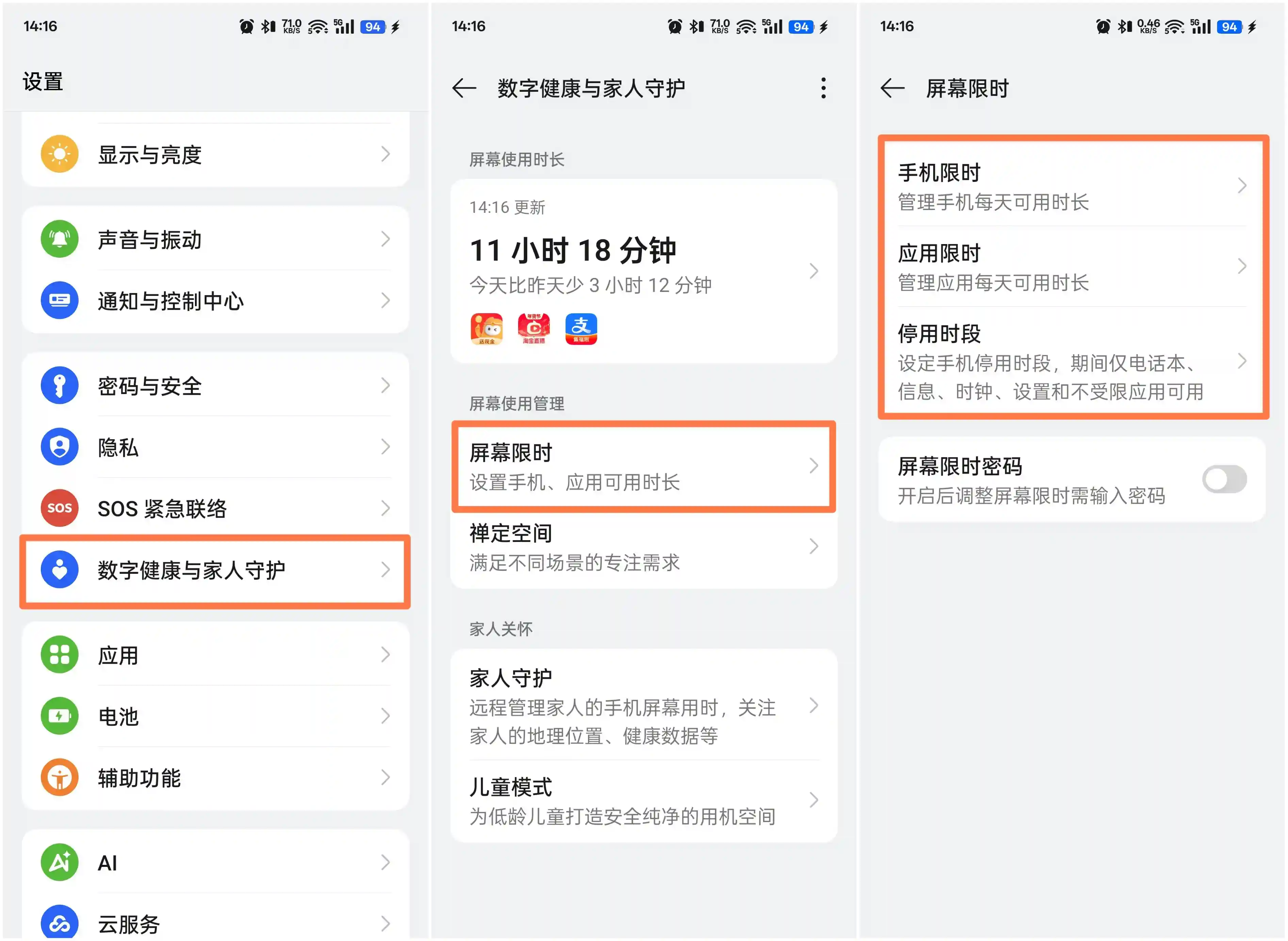 设置方法:进入「设置」——数字健康与家人守护——屏幕限时