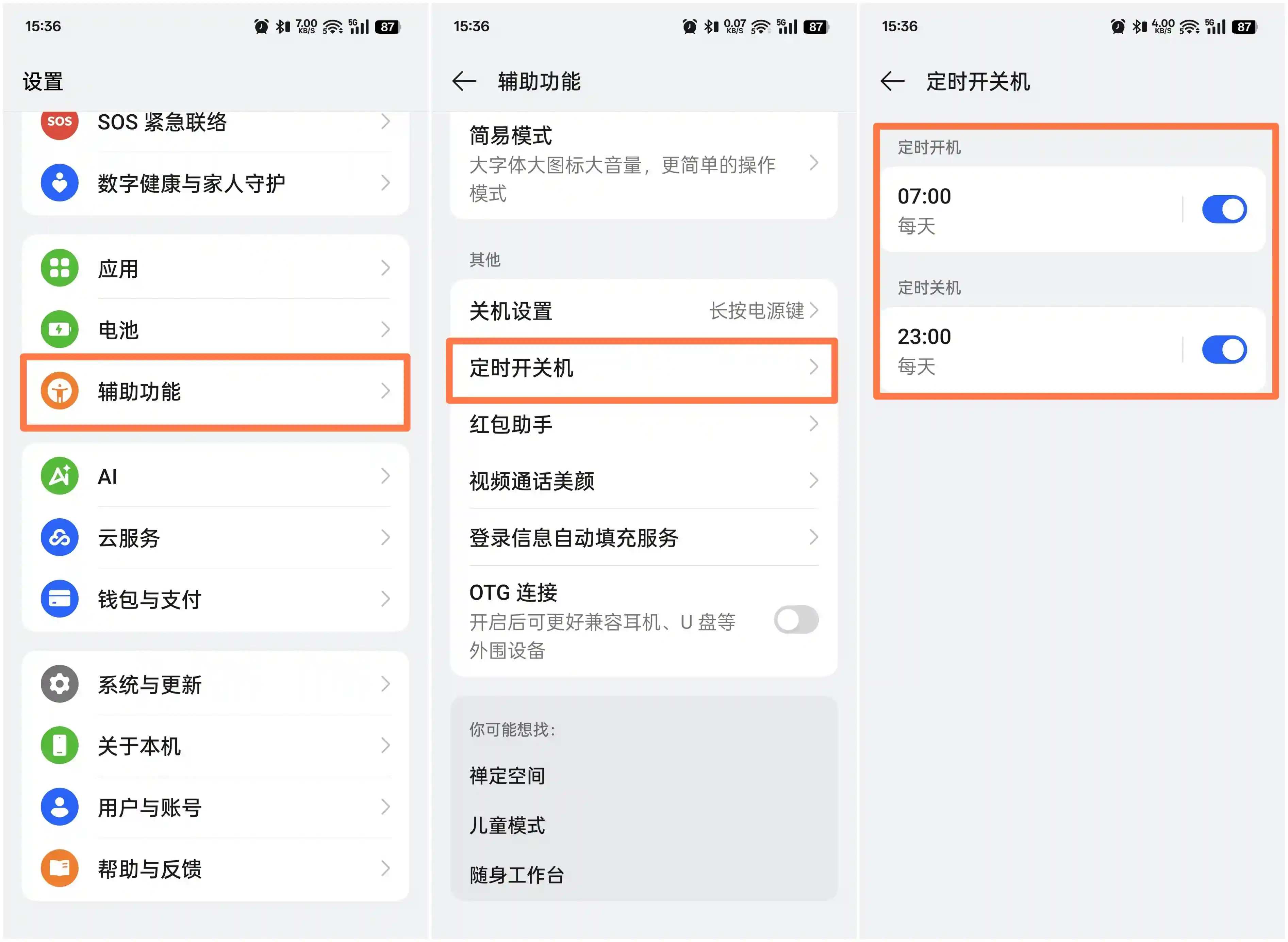设置方法:进入「设置」——辅助功能——定时开关机