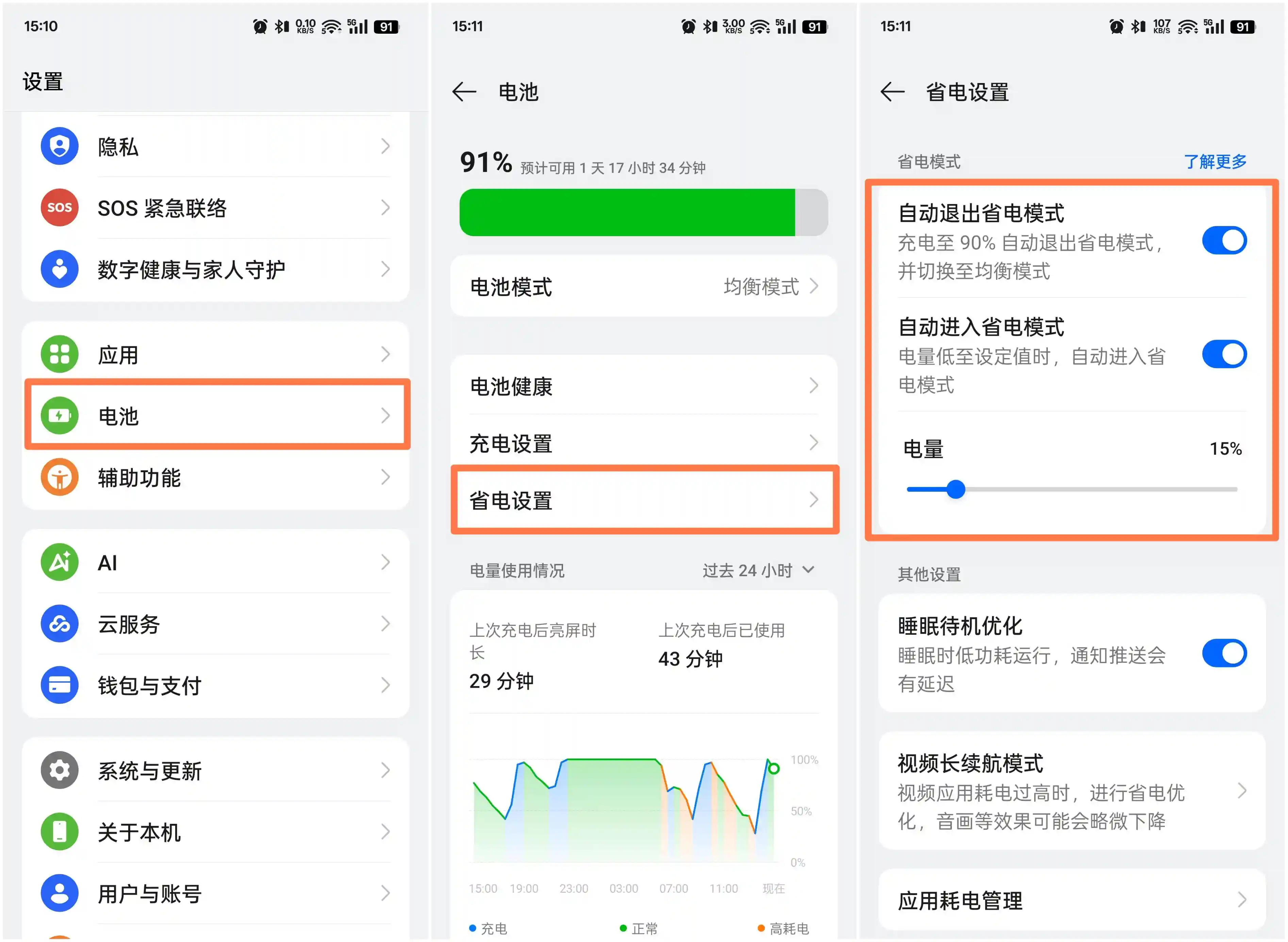 随着手机性能的增强,已承接越来越多的业务,使用场景也越来越广泛,使用时间也越来越长。长时间高频率的使用,让手机电量逐渐见底。如果暂时找不到合适的地方充电,便可能面临因电量耗尽而「失联」的窘况。ColorOS15监测到电量不足时,会触发预先设置的被动技能,从而自动开启「省电模式」,在略微降低系统体验的前提下,尽可能提升整体续航;直至有条件充电后,当系统监测到电量恢复到一定程度,便会自动解除此前设下的「封印」。所有操作一经设置,都会自然而然悄然运作。如果你也想如此方便,不妨开启以下设置。