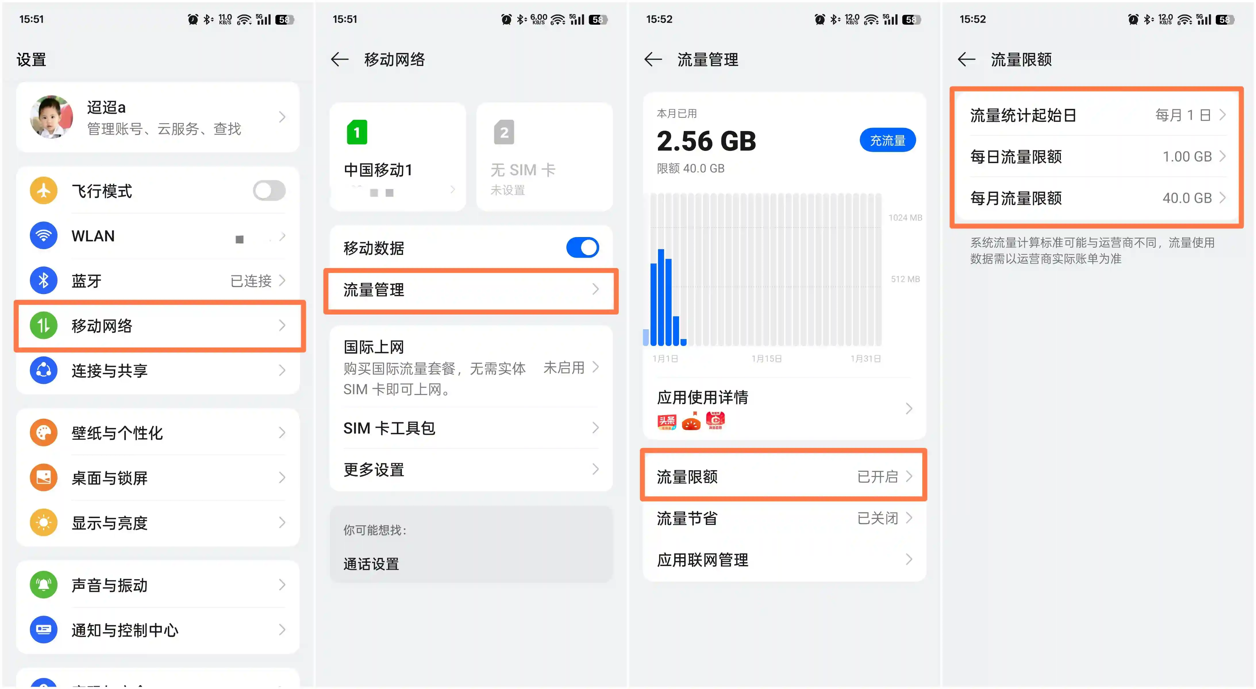 开启方法:进入「设置」——移动网络——流量管理——流量限额