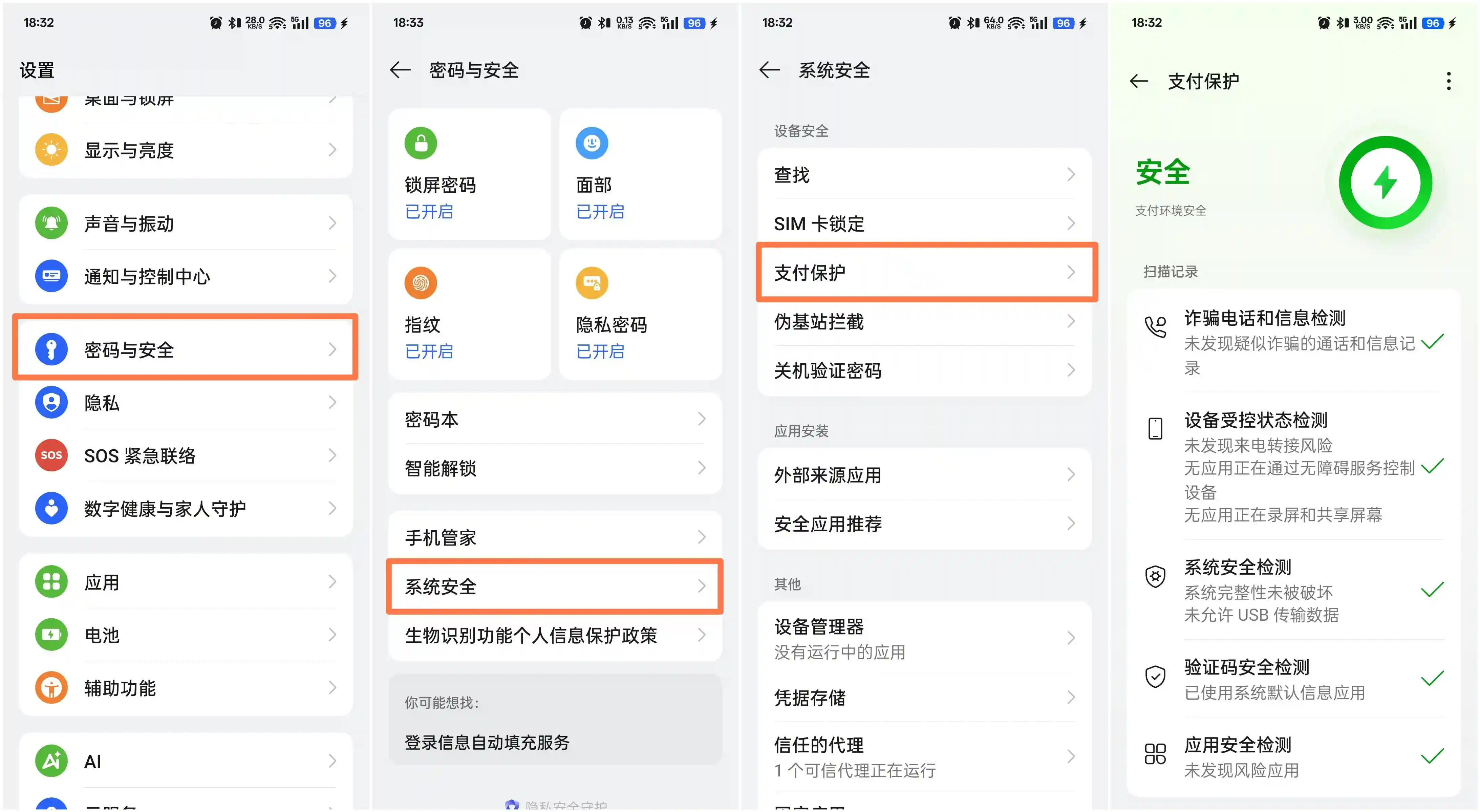 自主检测方法:进入「设置」——密码与安全——系统安全——支付保护