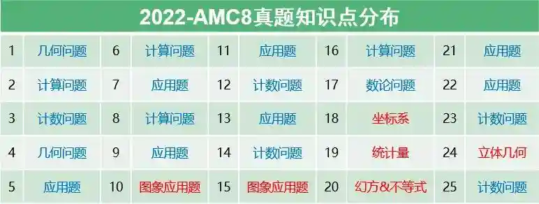 AMC8知识点范围包括了小学阶段所有的数学知识,还会涉及到一部分初中核心知识。以下是近两年的AMC8竞赛试题知识点分布,其中蓝色部分为小学数学内容,红色部分为初中课内内容。