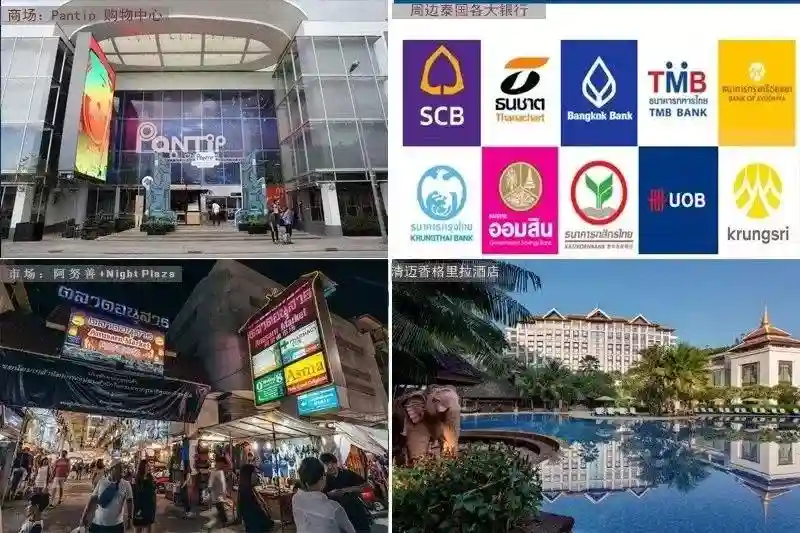 酒店:项目距清迈顶级酒店——香格里拉大酒店仅一墙之隔、站在自家窗台即可饱览香格里拉醉美中庭。项目周围更有安拉塔纳酒店、美萍酒店等多家五星级酒店环绕。