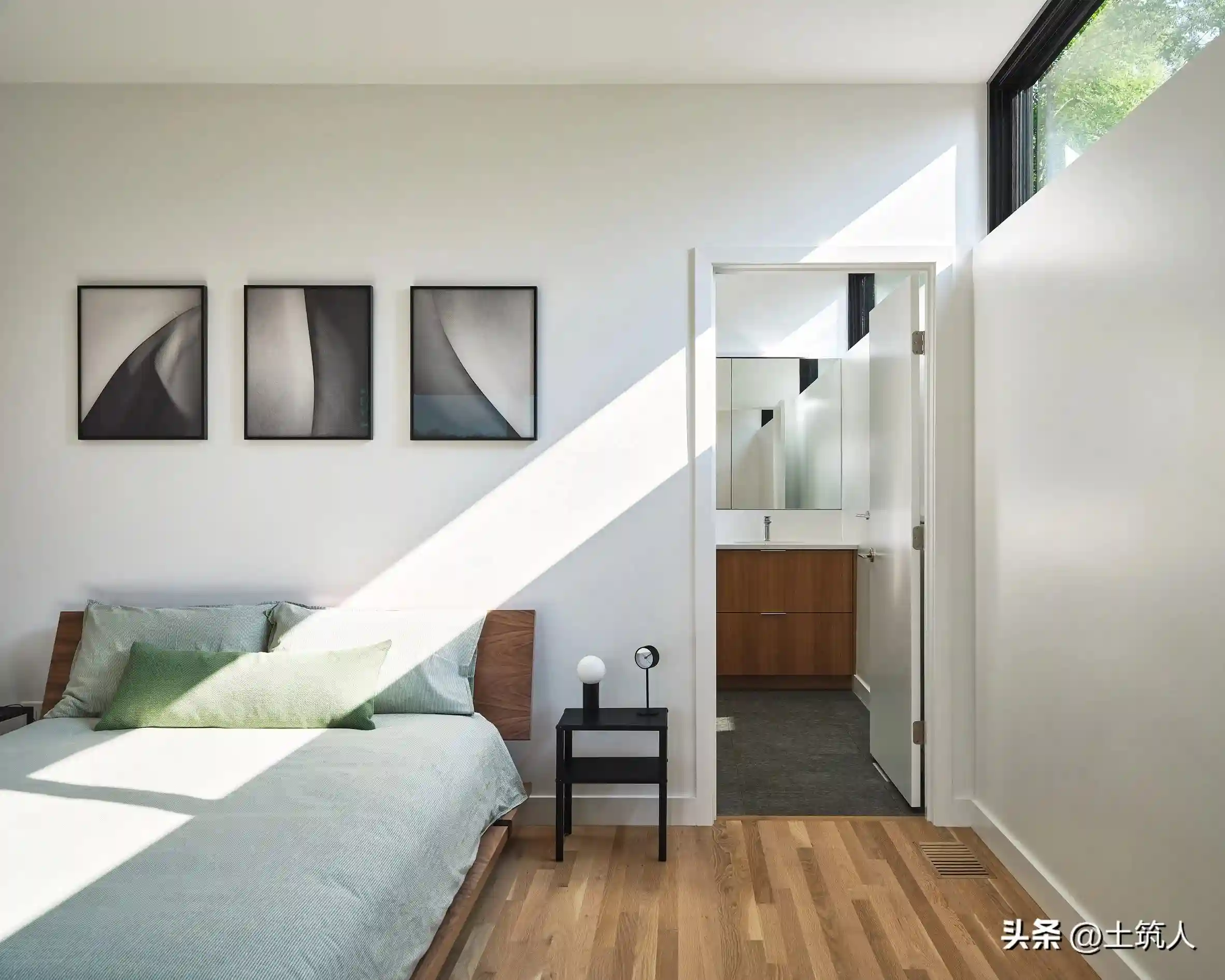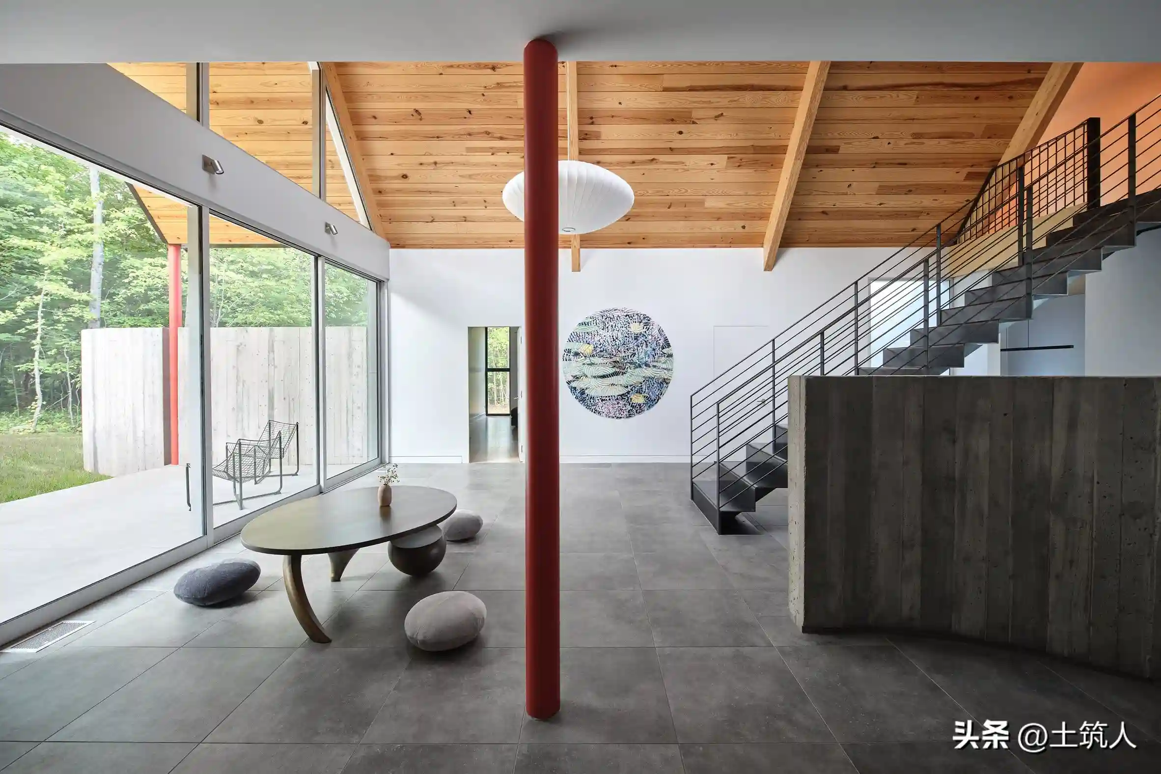 浮动楼梯通向阁楼的四个展馆——一间主套房、带有杰克和吉尔浴室的儿童房、一间客厅以及厨房——每一个展馆皆与大自然相逢,并拥有户外的框架景观。