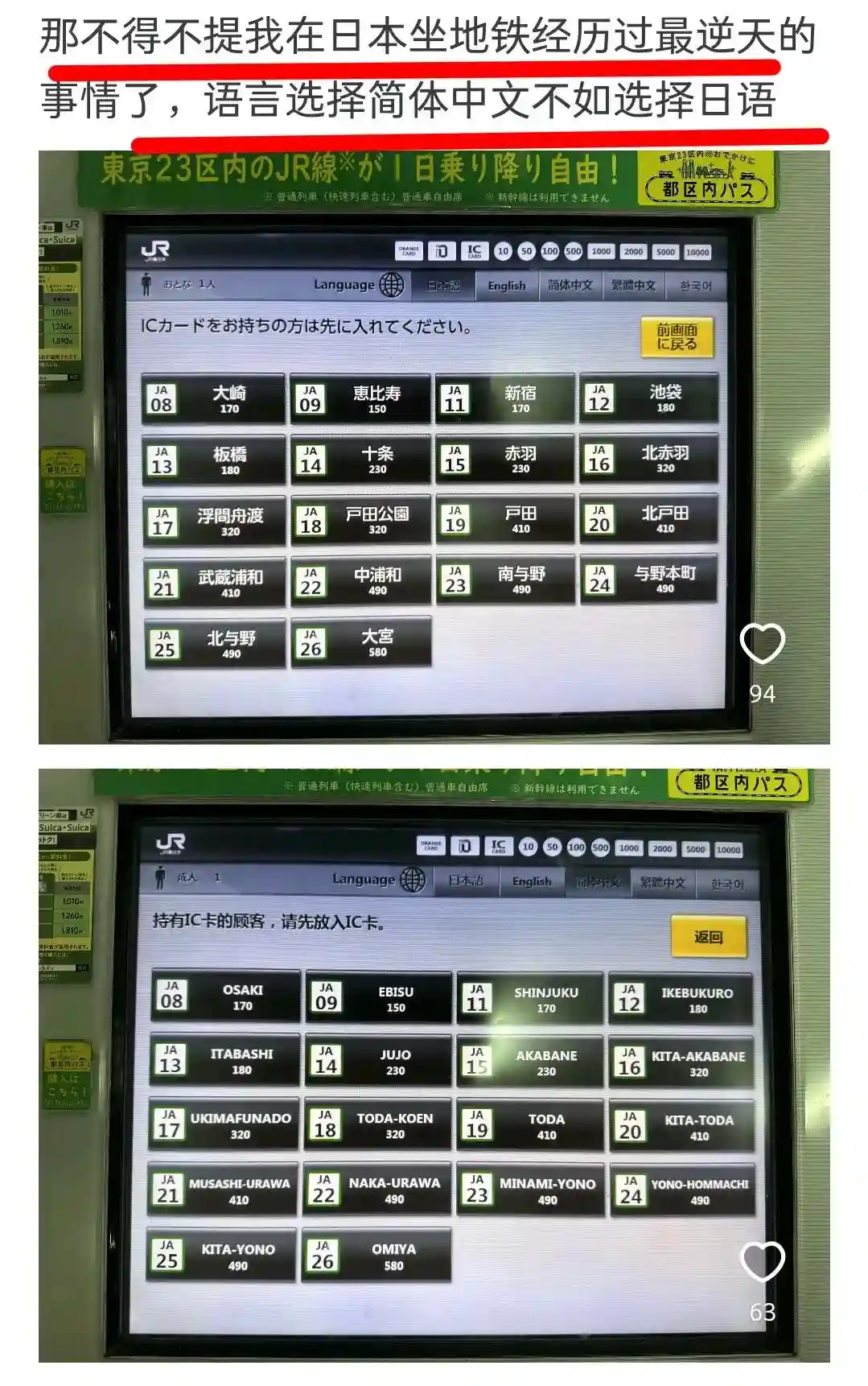 太真实了,从京都回东京的时候,在机器上自助购买新干线车票,用简体中文找品川找了好久,切换回日文瞬间就清晰明了了,这简体中文简直还不如不设置。如果想要做得更完善的话,应当把中文和罗马音都标注上,因为中文的发音和日语的发音差异很大,记住罗马音才有可能听懂语音报站,或者问路的时候也能够直接询问。比如你想去大琦,你不能读成“DaQi”,也不能听到“DaQi”就明白,只能是“OSAKI”……这很正常,因为这些字在日文里不是这样的读音,“Tokyo”和“dongjing”的读音也是不同的,以标准而言,使用罗马音至少能够从读音上知晓具体的地点。