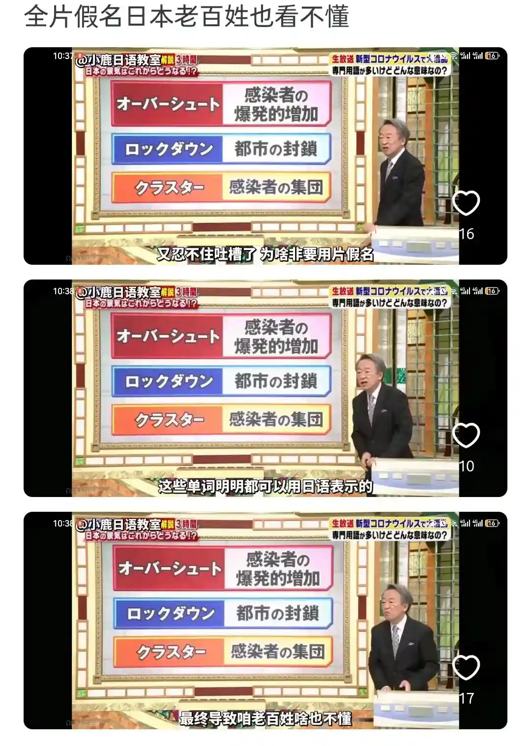 “overshoot”这个含义显然是日本人自己创造出来的,我在英文语境中很少听到这个词用来描述感染。实际上,日本没有接受过高等教育的普通民众对这两种(外来语和汉字词)都不太能看懂,因为本质上这两种文字对于他们来说都是外语。这些高级词汇,不论是读音还是写法都是外来的,与本地语言的逻辑不相符合。语言是追求简洁的,“ロックダウン”也就4个音节,连读或者直接读“lockdown”也就2个音节,而“都市の封鎖(toshinofusa)”则有5个音节,直接就败下阵来了。很多人喜欢用片假名单纯就是因为其音节比对应的汉字词少,而且不用费脑筋。