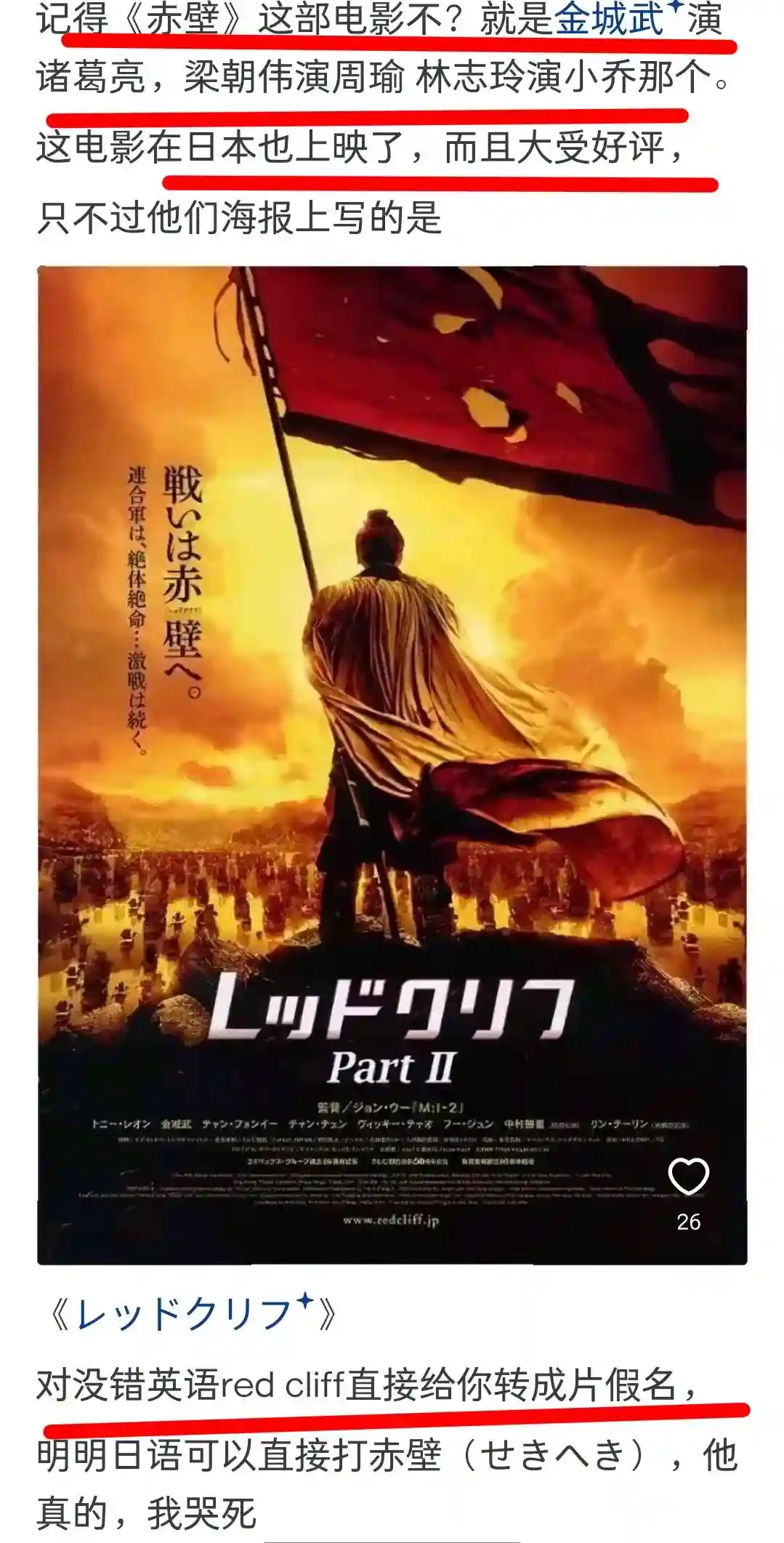 日本引进电影似乎有个约定俗成的做法,就是把电影的英文名进行片假名化处理,哪怕原意甚至原文完全能够用日文来表达。由于这部电影的发行方只提供了两种片名,一种是面向华语地区的《赤壁》,另一种是面向国际市场的《RedCliff》。日本显然不属于华语地区,所以只拿到了国际版本的片名,然后经过日本的“假名化拼写”,就变成了「レッドクリフ」。