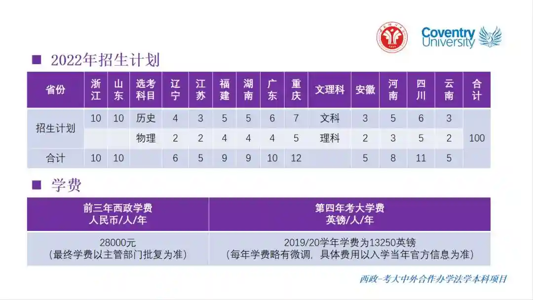 中外合作法学专业本科教育项目培养模式为“3+1”模式,即前三年在西南政法大学就读,第四年赴英国考文垂大学就读,顺利毕业后,可同时获得西南政法大学颁发的法学专业本科毕业证书、学士学位证书以及考文垂大学颁发的法学学士学位证书,第四年赴考文垂就读的学习生活经历将极大提升同学们的综合能力(考文垂大学是获得中国教育部认证的英国公立大学)。项目每年计划招生100人。