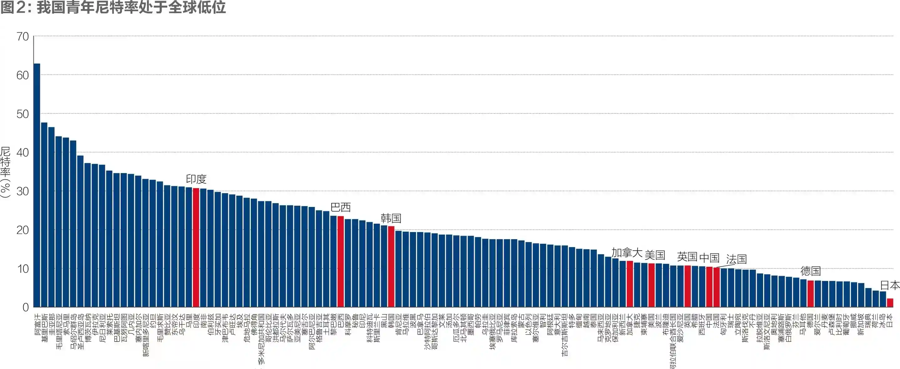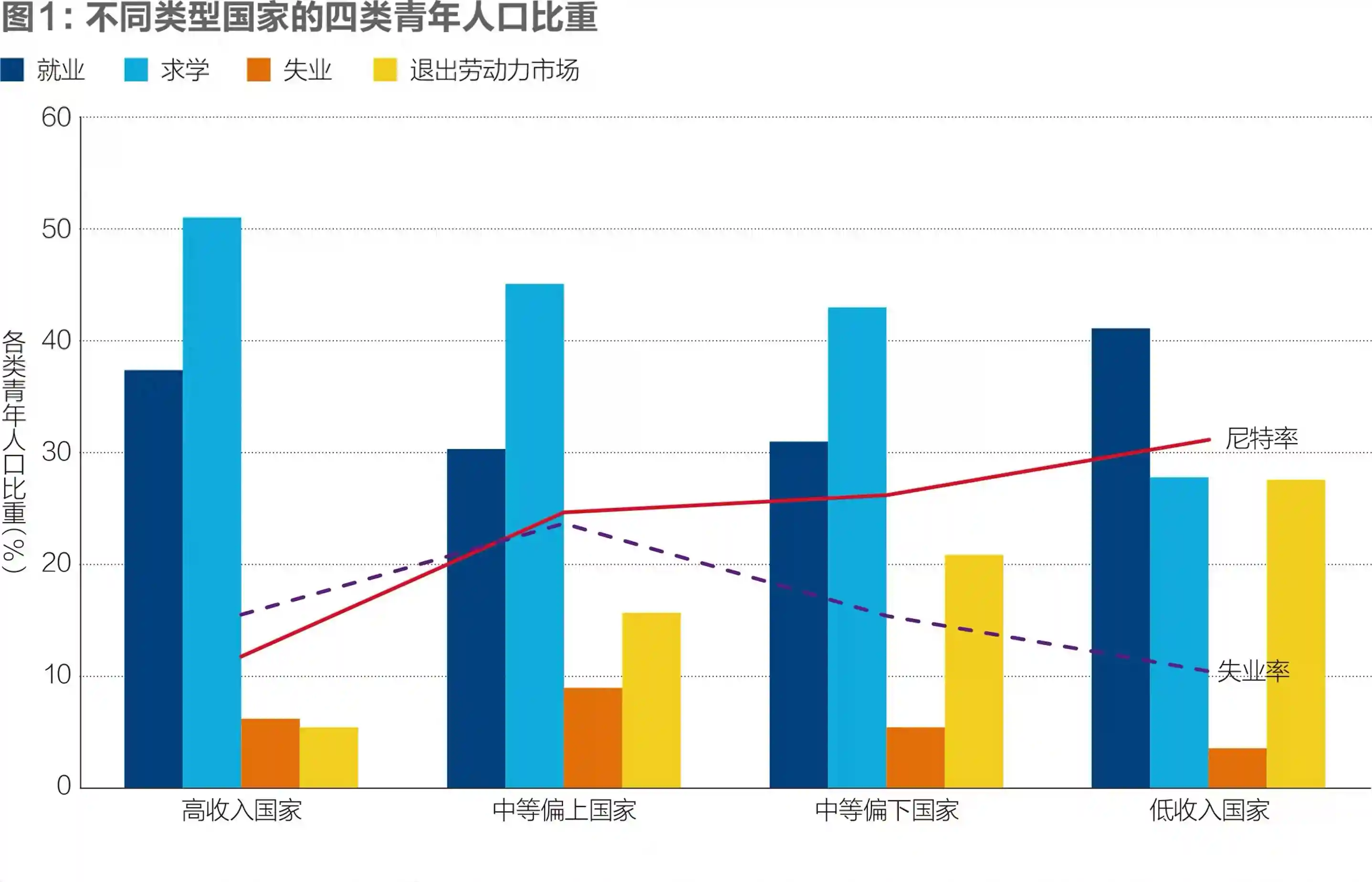 从典型国家来看,存在着不少“低失业率+高尼特率”组合的情况。低收入国家公布的青年失业率较低,但其退出劳动力市场的青年人口比重均值高达27.6%,大量适龄青年无法通过城市化和工业化进入现代生产部门,而处于劳动力闲置的状态,由尼特率反映出的低收入国家青年就业压力更贴近现实。一些高收入国家也存在着失业率和尼特率的反差,如韩国2019年的青年失业率仅有10.0%,但其尼特率已高达20.8%,后者所反映出的社会不稳定隐患明显更大。
