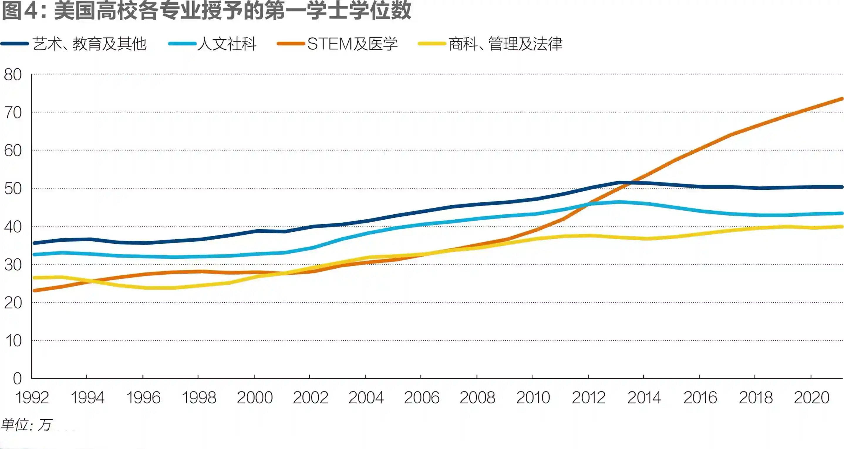 近年来我国新产业新赛道创设了大量技术型岗位需求,但据调研了解,由于毕业生专业能力不匹配,并未都能转化为现实的新增就业,科技型企业“招人难”和青年“就业难”并存。相比我国高校近年来文科人数增长较快,自2011年以来美国高校扩招中86.2%的份额,流向了STEM(包含科学、技术、工程和数学)及医学领域,文科生扩招比重大幅下降(见图4)。