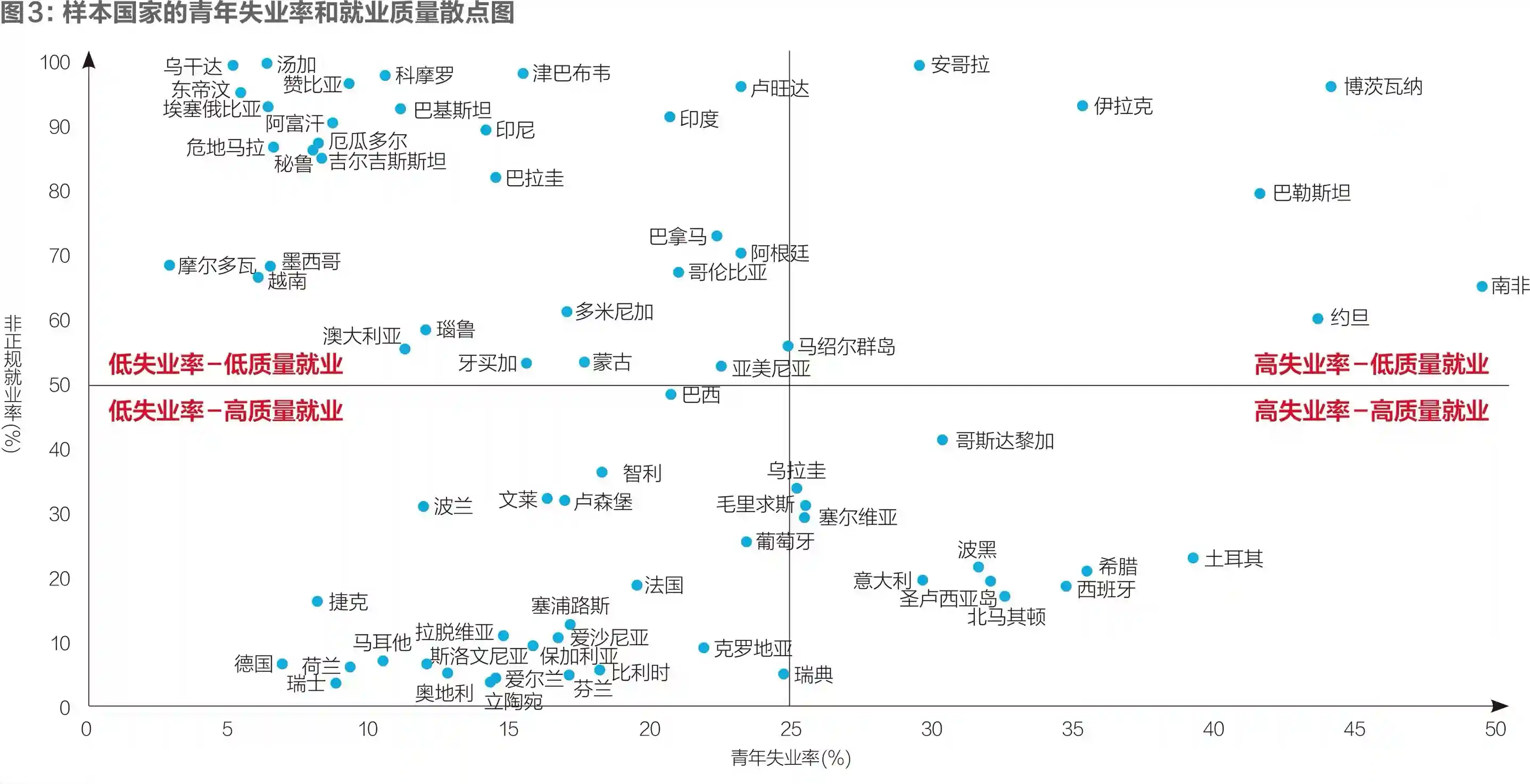 与整体就业质量相比,青年就业的质量还要更低一些。在高收入、中等收入和低收入国家中,青年的非正规就业率比整体的非正规就业率高6.4个、6.5个和5.7个百分点,青年人在各国劳动力市场都属于相对弱势的群体。在图3所示的“失业率-就业质量”的二维坐标里,我们以失业率=25%、非正规就业率=50%为界,划分出四个区间,其中有40.8%的样本国家的青年处于低失业率但低质量就业区间。