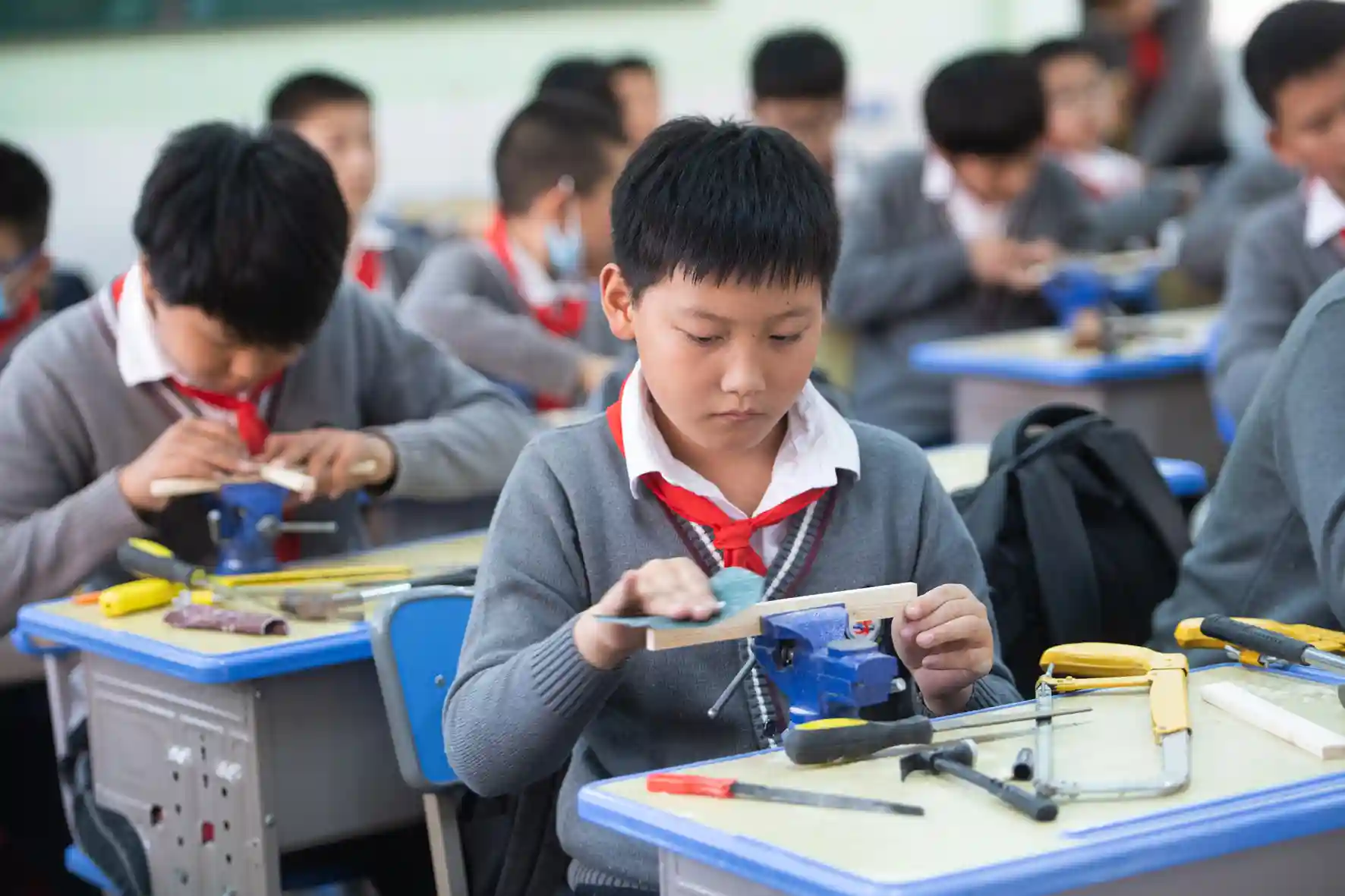 5月16日,湖北省荆州市沙市大赛巷小学学生在课后进行木工练习。新华社记者肖艺九摄