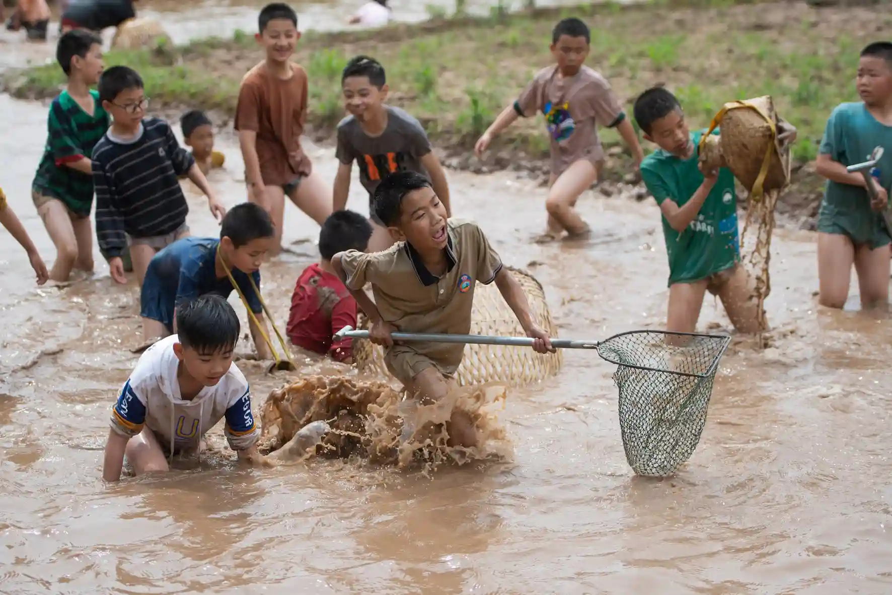 5月17日,在湖北省荆州市中小学生社会实践基地,学生体验鱼塘捕鱼。新华社记者肖艺九摄
