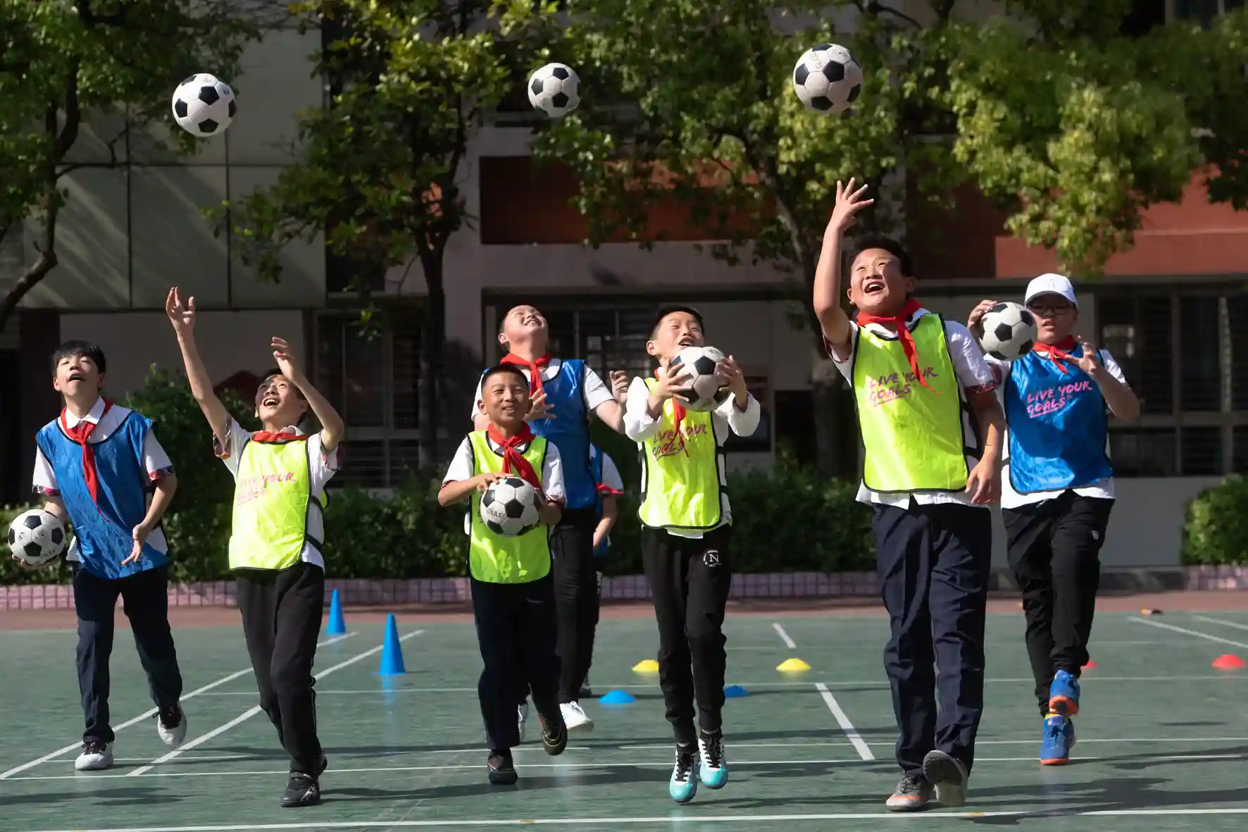 5月16日,湖北省荆州市沙市大赛巷小学学生在课后准备踢足球。新华社记者肖艺九摄