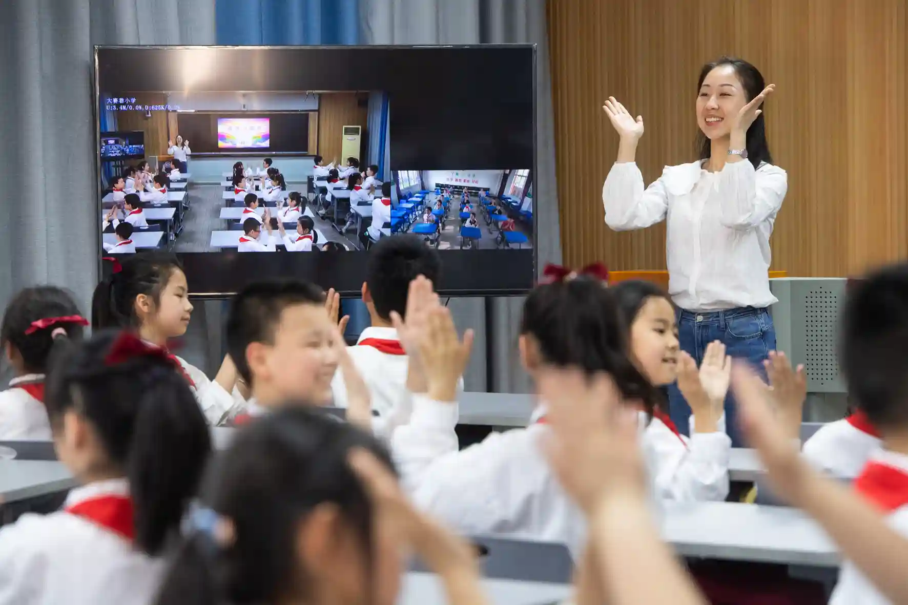 5月16日,在湖北省荆州市沙市大赛巷小学,学生通过“空中课堂”与偏远乡镇的丫角小学一起进行韵律操活动。新华社记者肖艺九摄