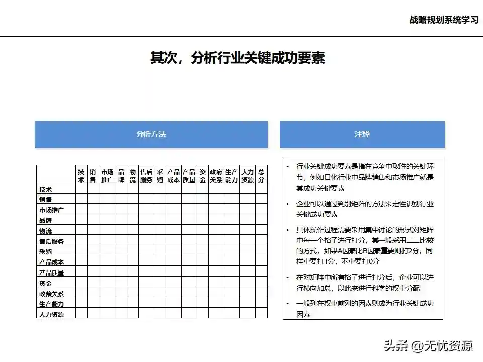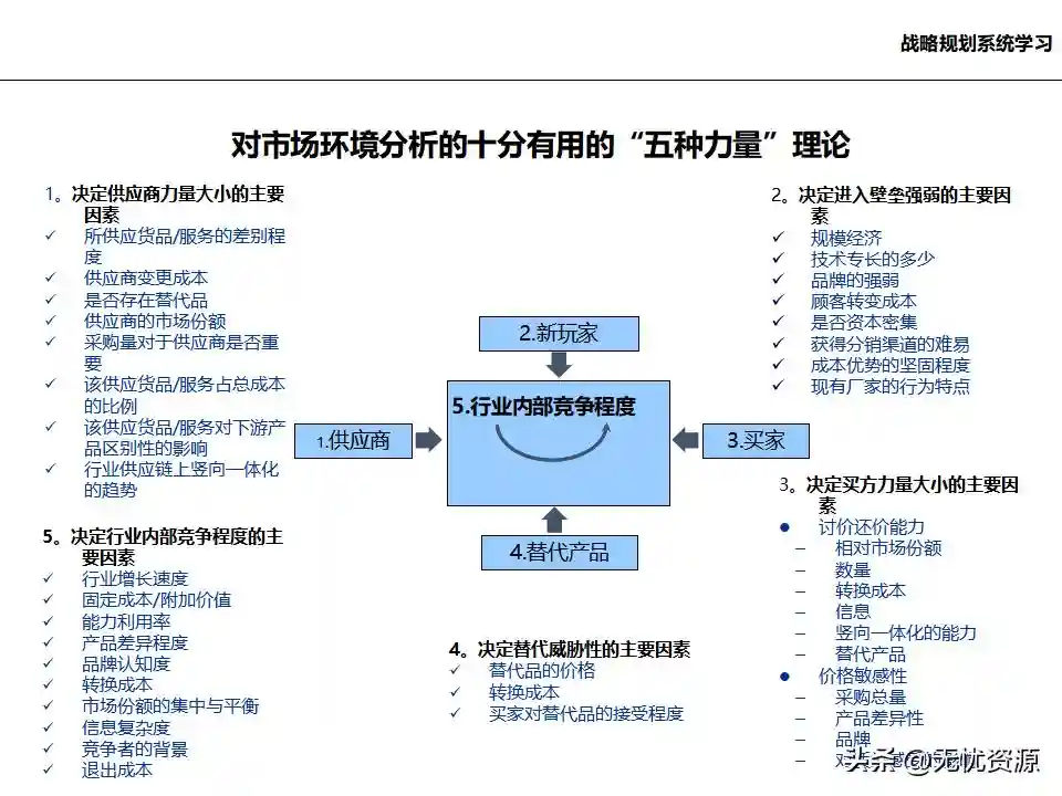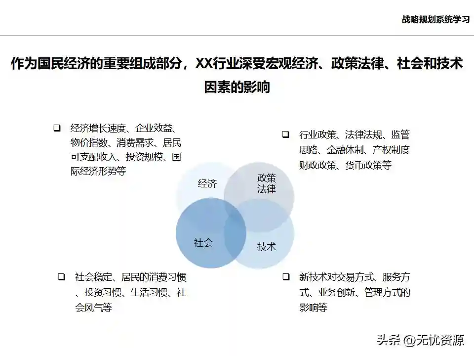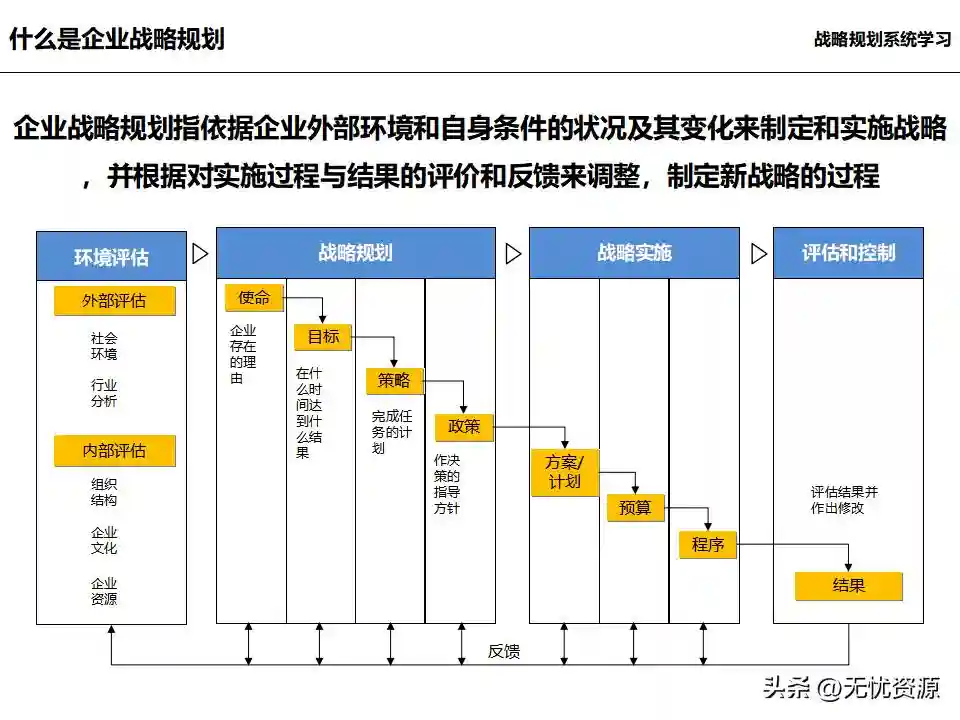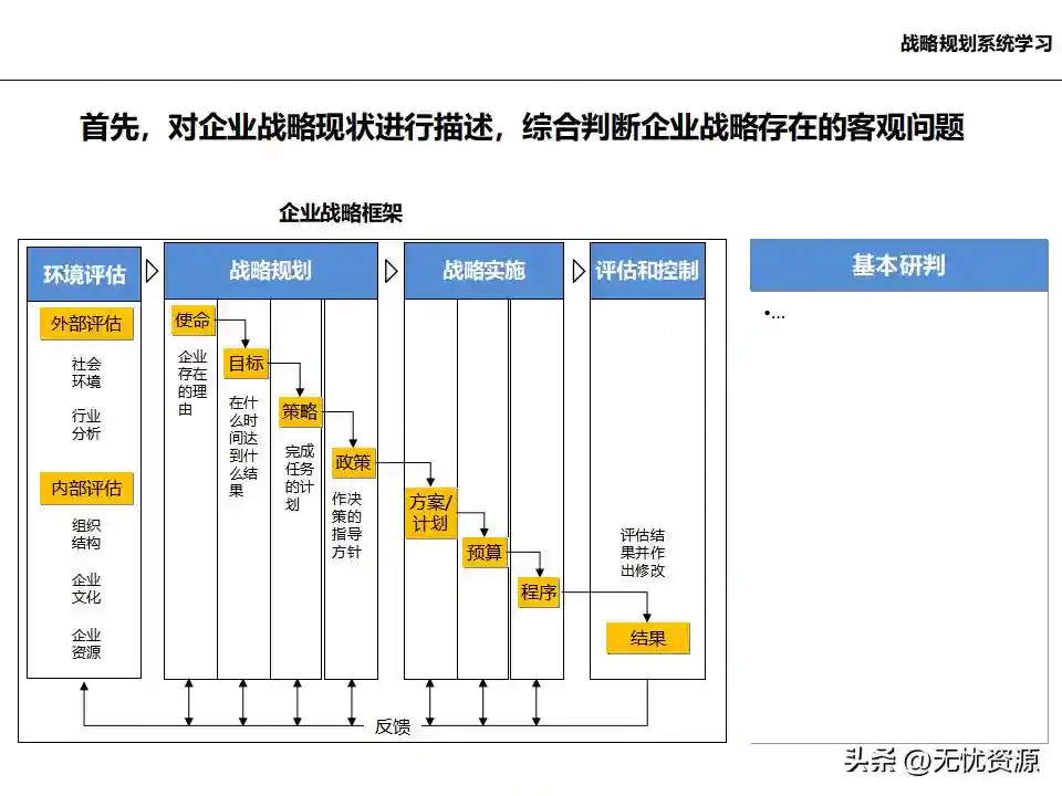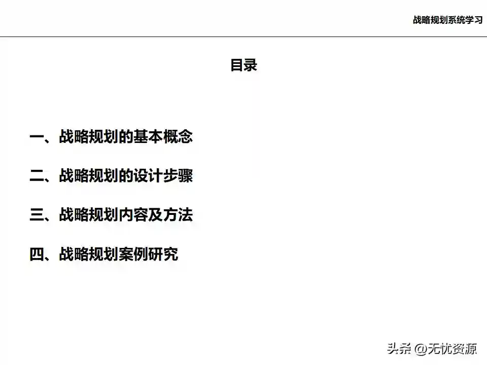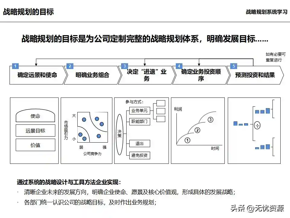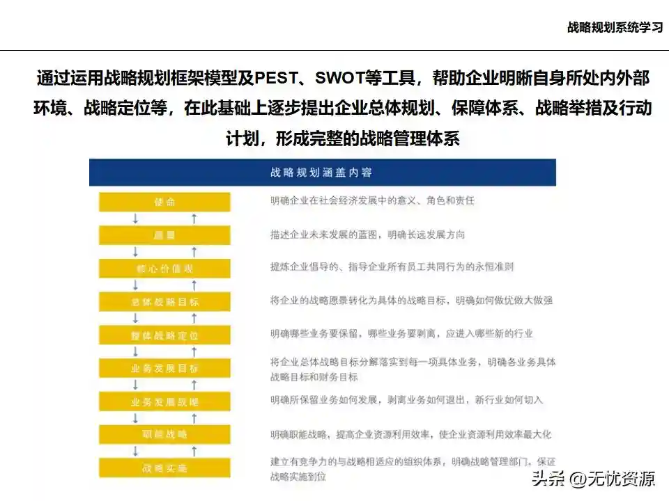 (二)战略规划方法战略规划方法包括PEST分析、SWOT分析、五力模型分析、波士顿矩阵分析等。这些方法工具帮助企业明晰自身所处内外部环境、战略定位等,在此基础上逐步提出企业总体规划、保障体系、战略举措及行动计划,形成完整的战略管理体系。