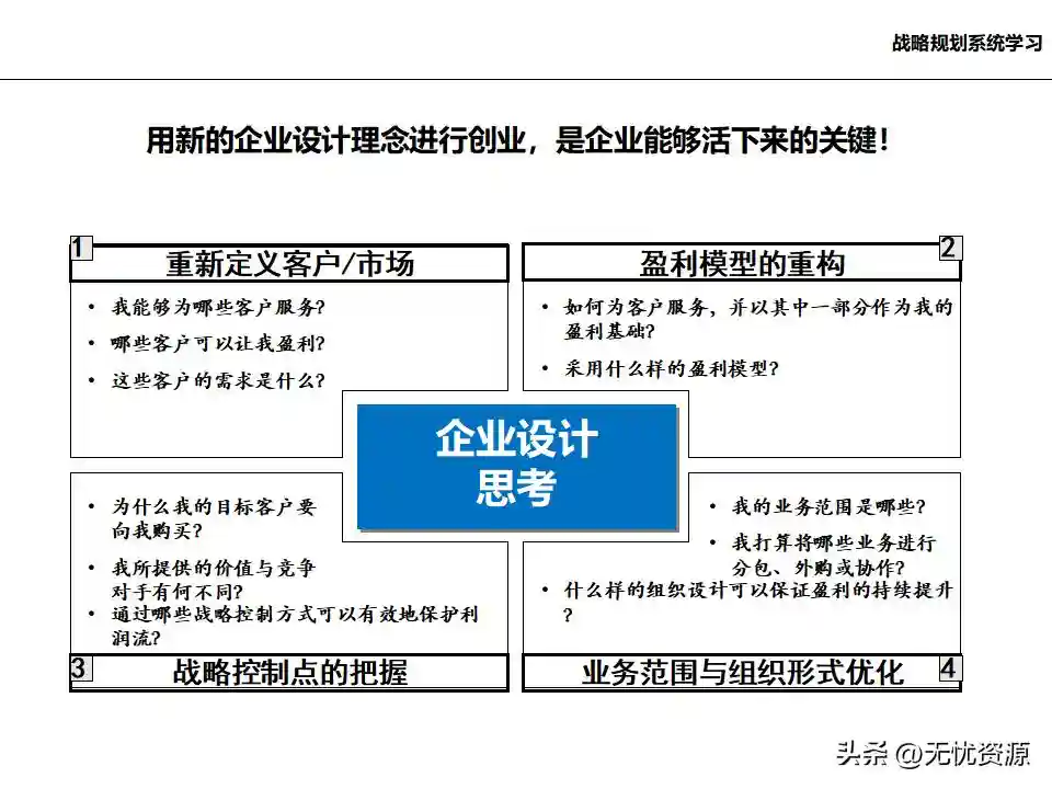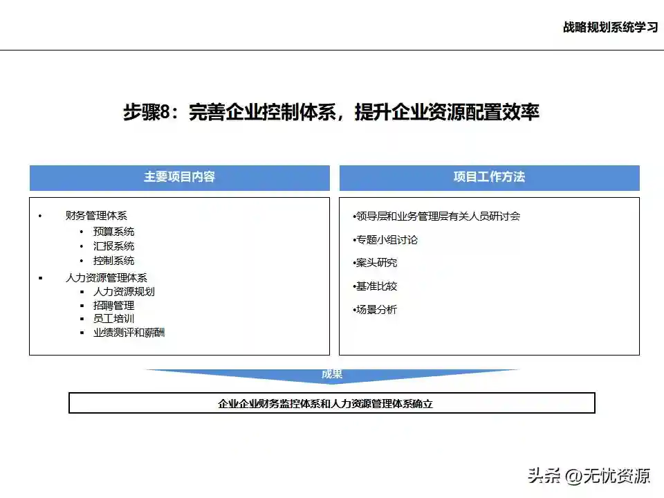 (八)完善企业控制体系,提升企业资源配置效率完善企业控制体系,提升企业资源配置效率。这包括财务管理体系、预算系统、汇报系统、控制系统,以及人力资源管理体系等。