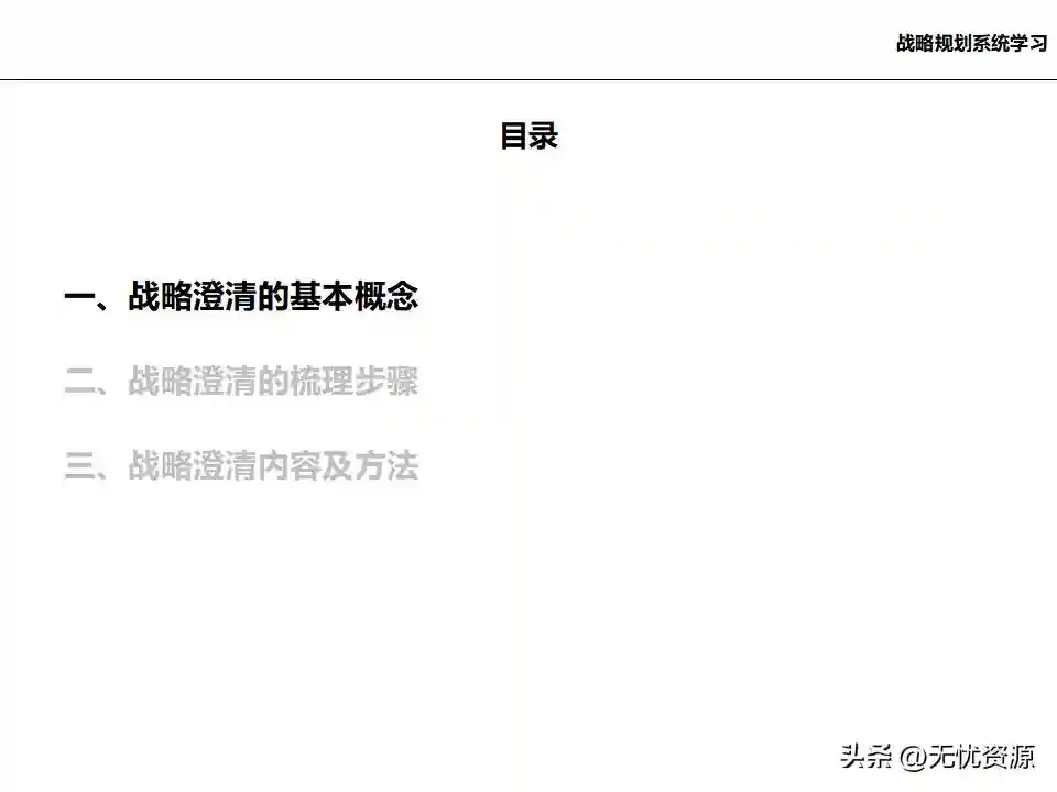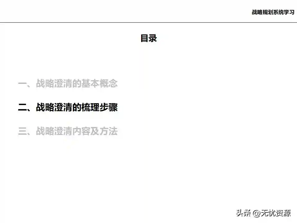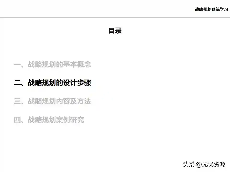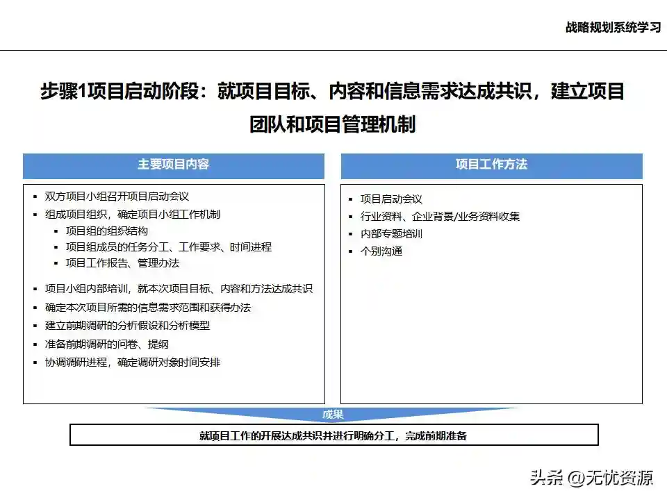 一、战略规划的基本概念二、战略规划的设计步骤(一)项目启动阶段项目启动阶段的主要任务是就项目目标、内容和信息需求达成共识,建立项目团队和项目管理机制。这包括召开项目启动会议,组成项目组织,确定项目小组工作机制,以及进行项目小组内部培训等。
