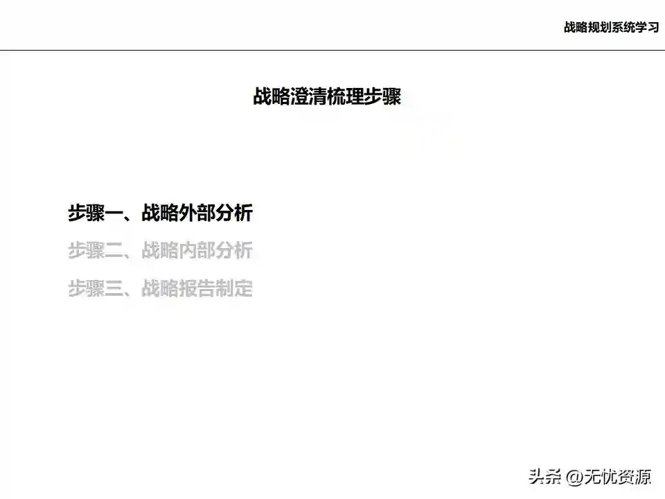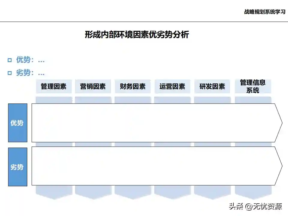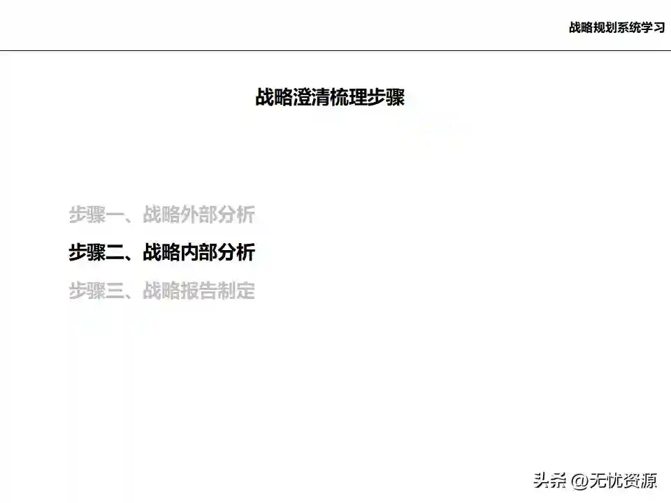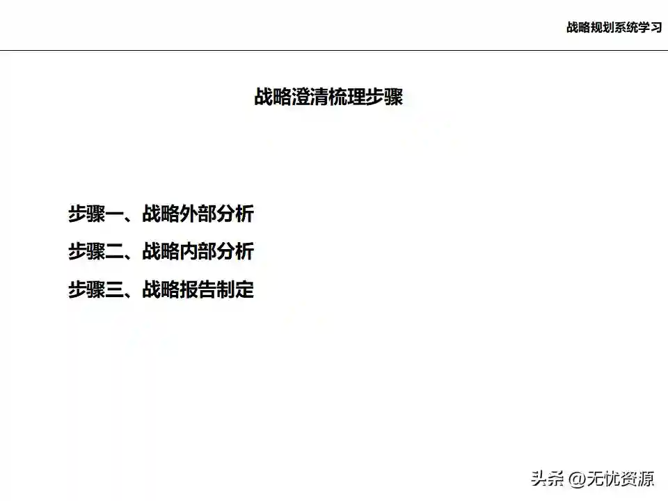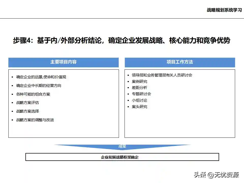 (四)基于内/外部分析结论,确定企业发展战略、核心能力和竞争优势基于内/外部分析结论,确定企业的远景、使命和价值观,明确企业中长期的经营方向。通过战略方案评估、战略方案选择、战略方案的调整与改进,最终确定企业发展战略框架。