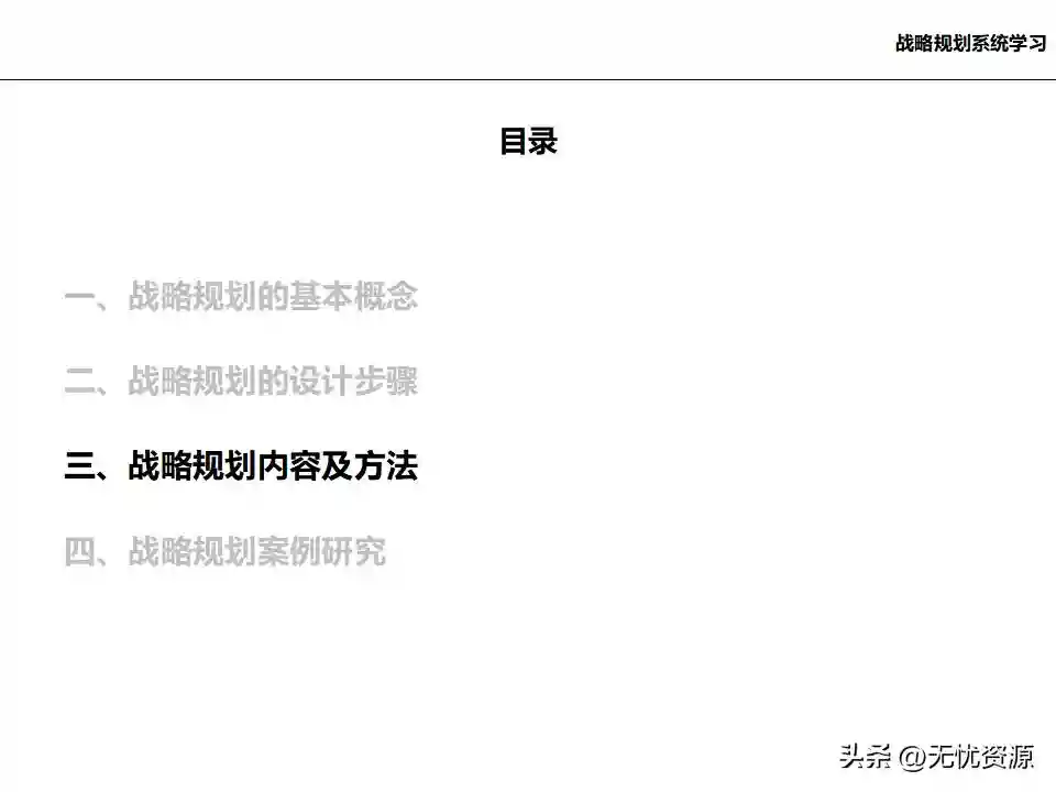 三、战略规划内容及方法(一)战略规划内容战略规划内容涵盖企业的发展战略、业务组合、核心能力、竞争优势、组织结构、管理流程、财务预测等多个方面。通过对企业内外部环境的深入分析,明确企业的长期目标和发展方向,制定相应的战略举措和行动计划。