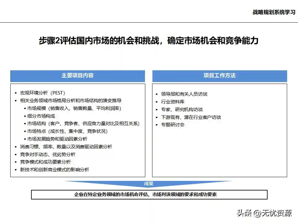 (二)评估国内市场的机会和挑战此阶段需评估国内市场的机会和挑战,确定市场机会和竞争能力。通过宏观环境分析(PEST)、相关业务领域市场格局分析、市场规模、细分市场构成、市场结构、市场特点、市场发展趋势和驱动因素分析等,明确企业在特定业务领域的市场机会评估、市场对该领域的要求和成功要素。