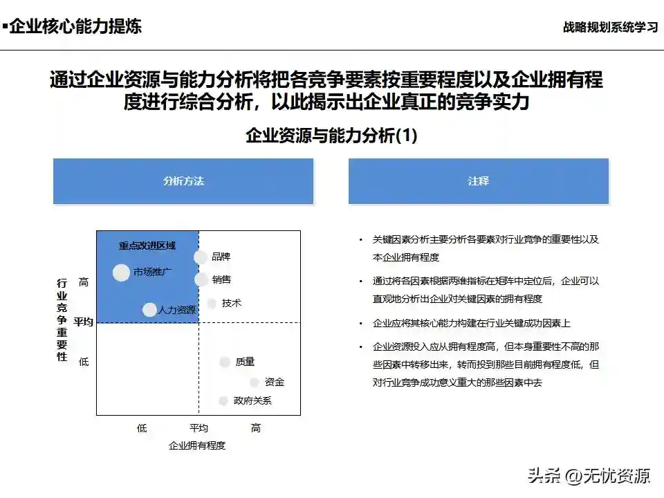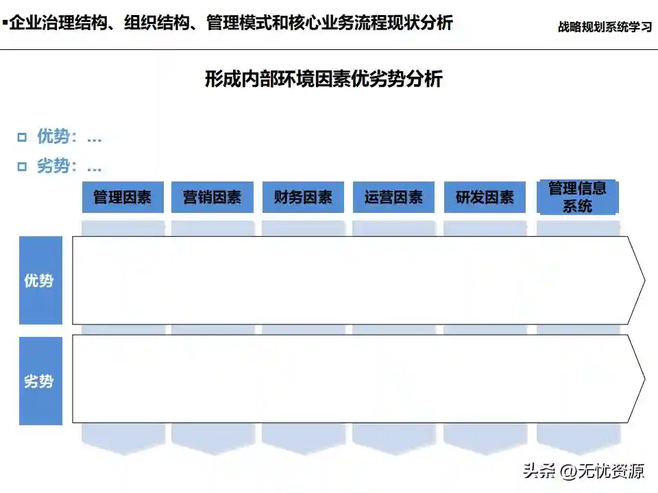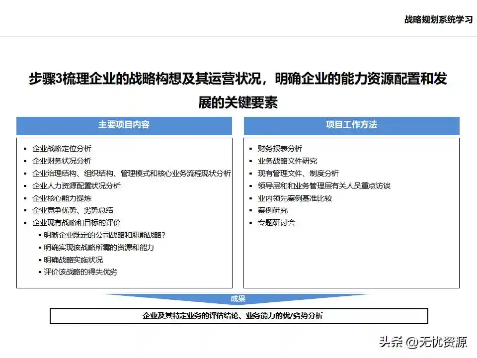 (三)梳理企业的战略构想及其运营状况梳理企业的战略构想及其运营状况,明确企业的能力资源配置和发展的关键要素。这包括企业战略定位分析、企业财务状况分析、企业治理结构、组织结构、管理模式和核心业务流程现状分析,以及企业人力资源配置状况分析等。